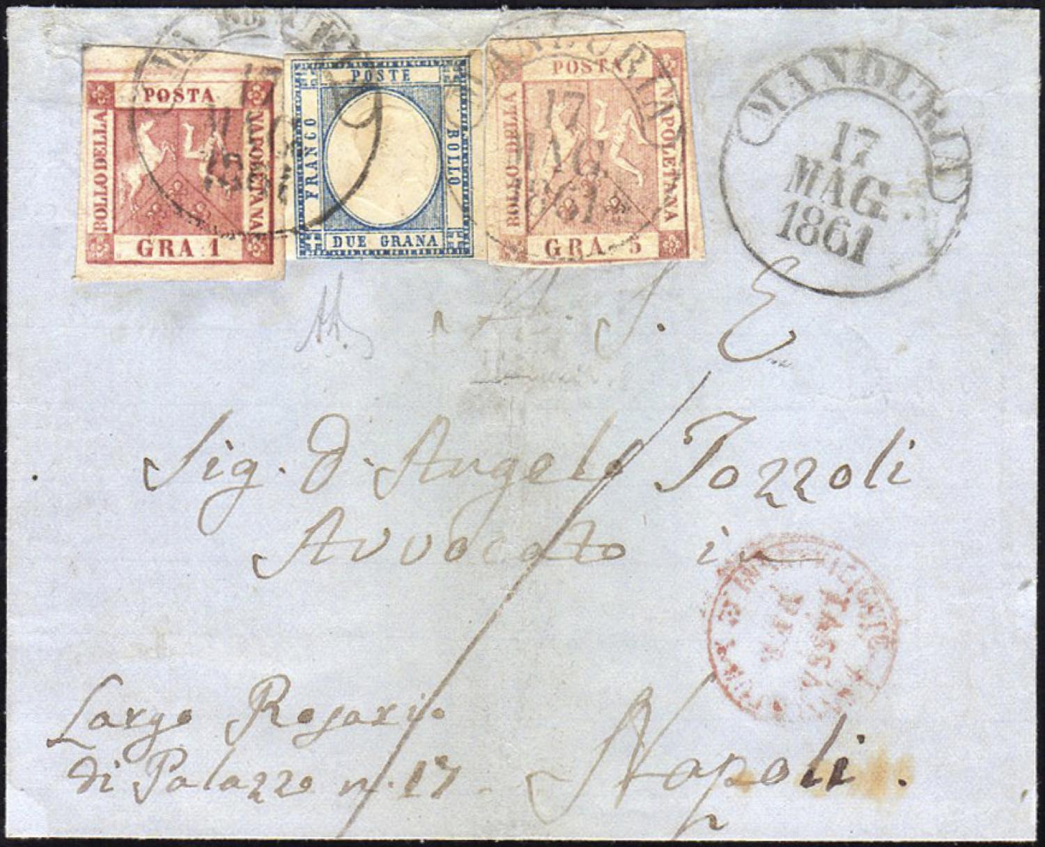 1861 - 1 grano carminio, II tavola, perfetto, 5 grana rosa brunastro I tavola, giusto in basso, in affrancatura mista con 2 grana azzurro delle Province Napoletane, margine inferiore a filo (4,8,20), su sovracoperta di lettera da Manduria 17/5/1861 (cerchio punti 13) a Napoli, insufficientemente affrancata e tassata. Raro insieme! A.Diena.