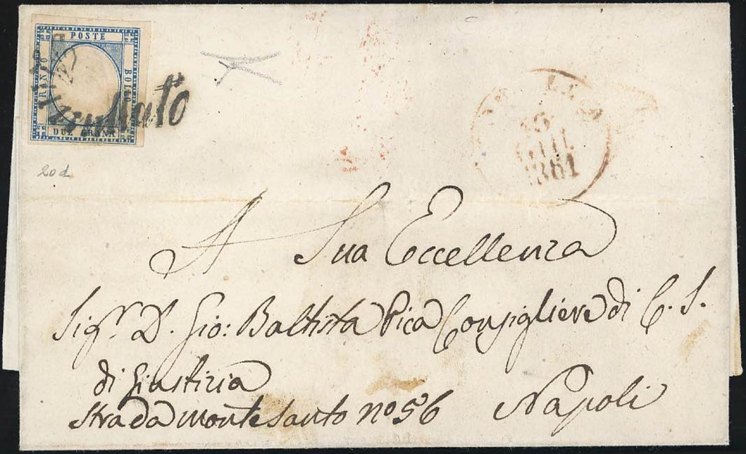 AQUILA, svolazzo + cerchio rosso punti 10 - 2 grana (20d), perfetto, su sovracoperta di lettera del 16/6/1861 per Napoli. Bottacchi.