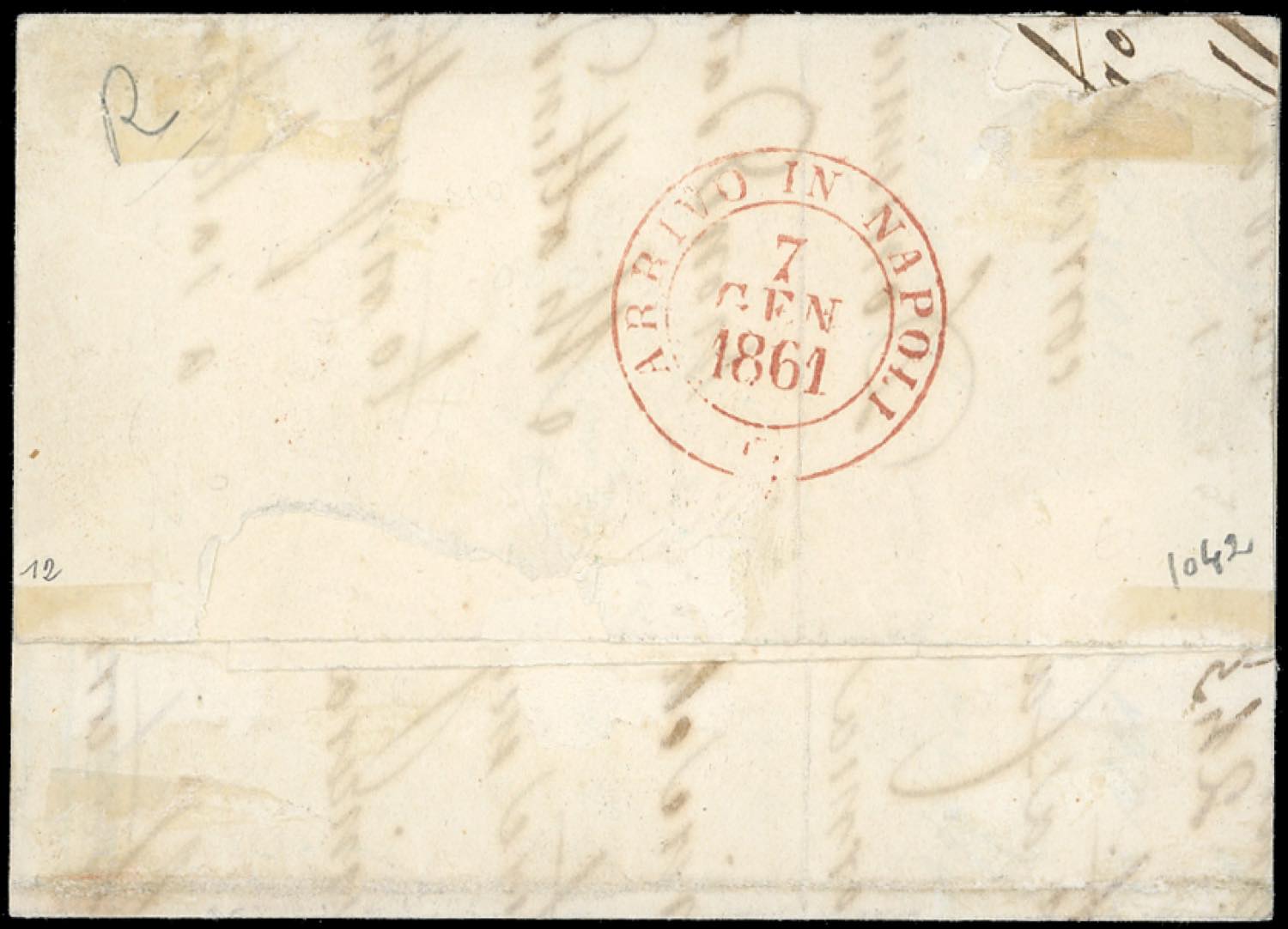 BISCEGLIE, svolazzo + cerchio rosso con datario capovolto punti 12 - 2 grana (6), perfetto, su lettera del 5/1/1861 per Napoli. Bella e rara. Russo, cert. Sorani.