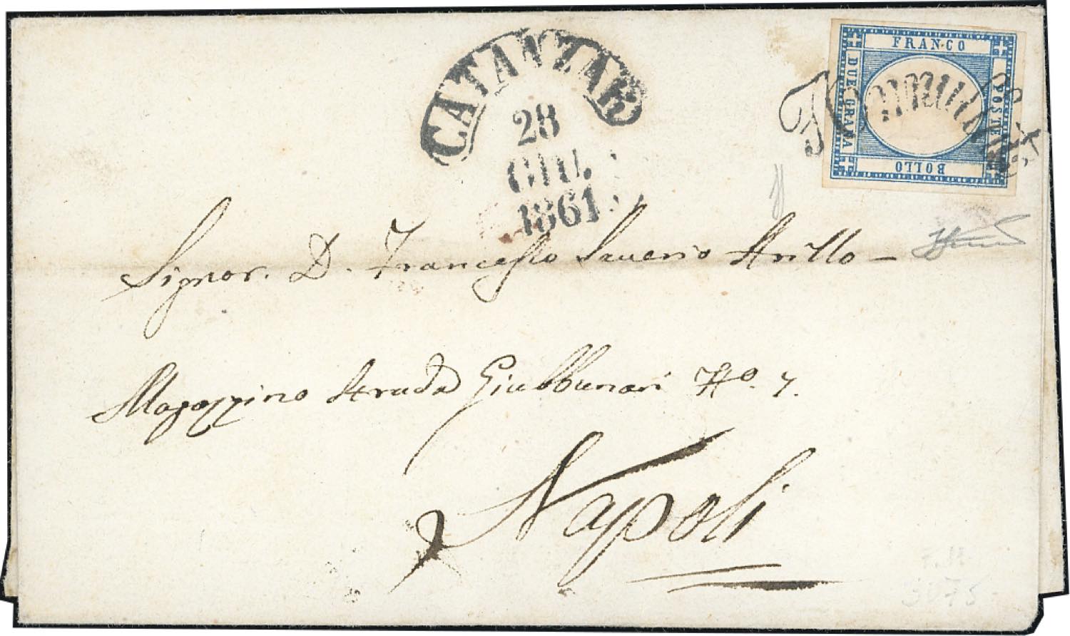 CATANZARO, svolazzo + cerchio punti 11 - 2 grana (20d), perfetto, su sovracoperta di lettera del 28/6/1861 per Napoli. Molto bella! ... Read more