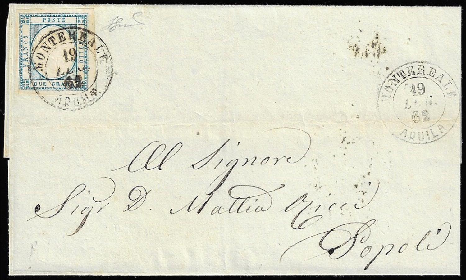 MONTEREALE, doppio cerchio punti 9 - 2 grana (20), piccolo taglio di forbici in basso, su sovracoperta di lettera del 19/7/1862 per Popoli. Ferrario.
