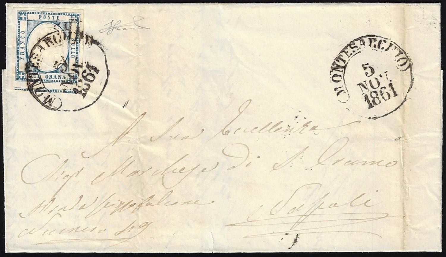 MONTESARCHIO, cerchio punti 10 - 2 grana (20), perfetto, su sovracoperta di lettera del 5/11/1861 per Napoli. Ferrario.