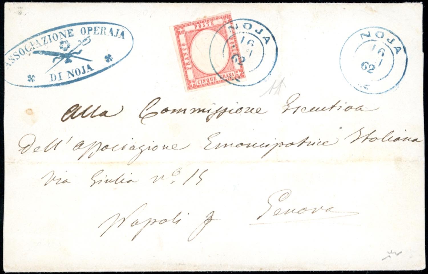 NOJA, doppio cerchio azzurro punti 10 - 5 grana (21), difetti, su sovracoperta del 16/6/1861 per Genova. D'effetto. A.Diena, Chiavarello. Ex coll. Imperato.