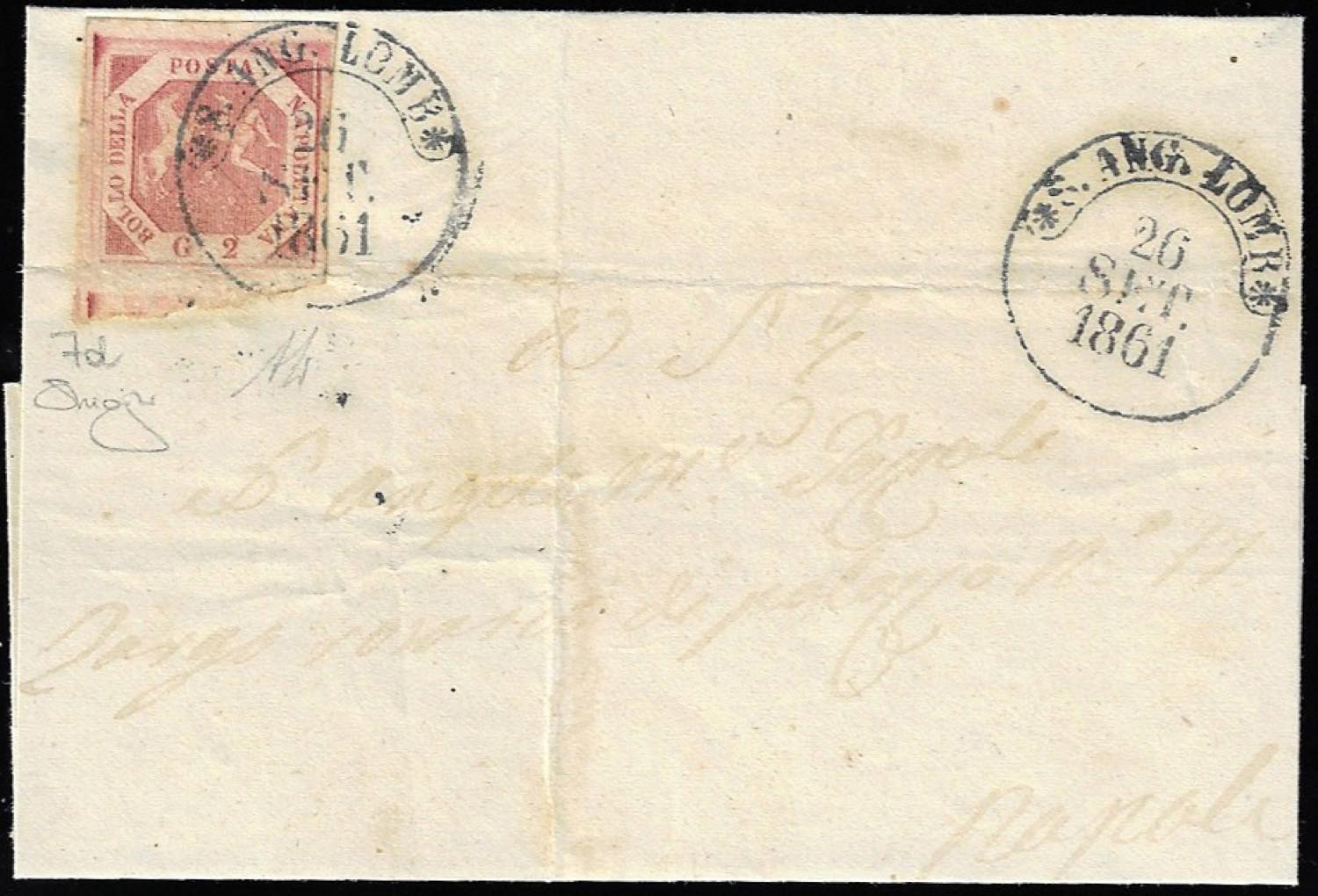 S.ANGELO DEI LOMBARDI, cerchio punti 13 - 2 grana (7d), lieve piega orizzontale in basso, che lascia il francobollo perfetto, su sovracoperta di lettera del 26/9/1861 per Napoli. Cert. Oro Raybaudi.