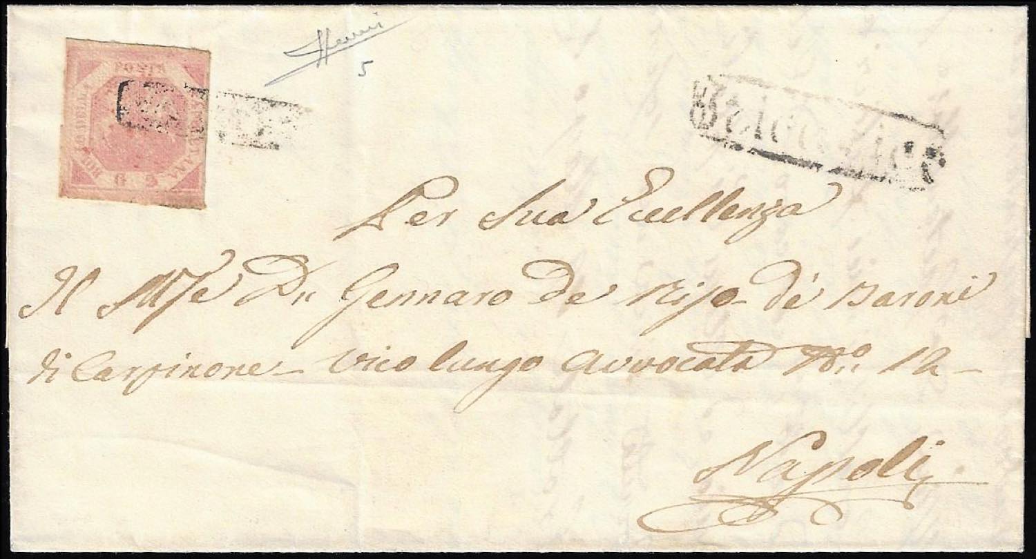 TRICARICO, annullato + ovale punti 11 - 2 grana (5), perfetto, su lettera del 19/3/1859 per Napoli. Cert. Sorani.