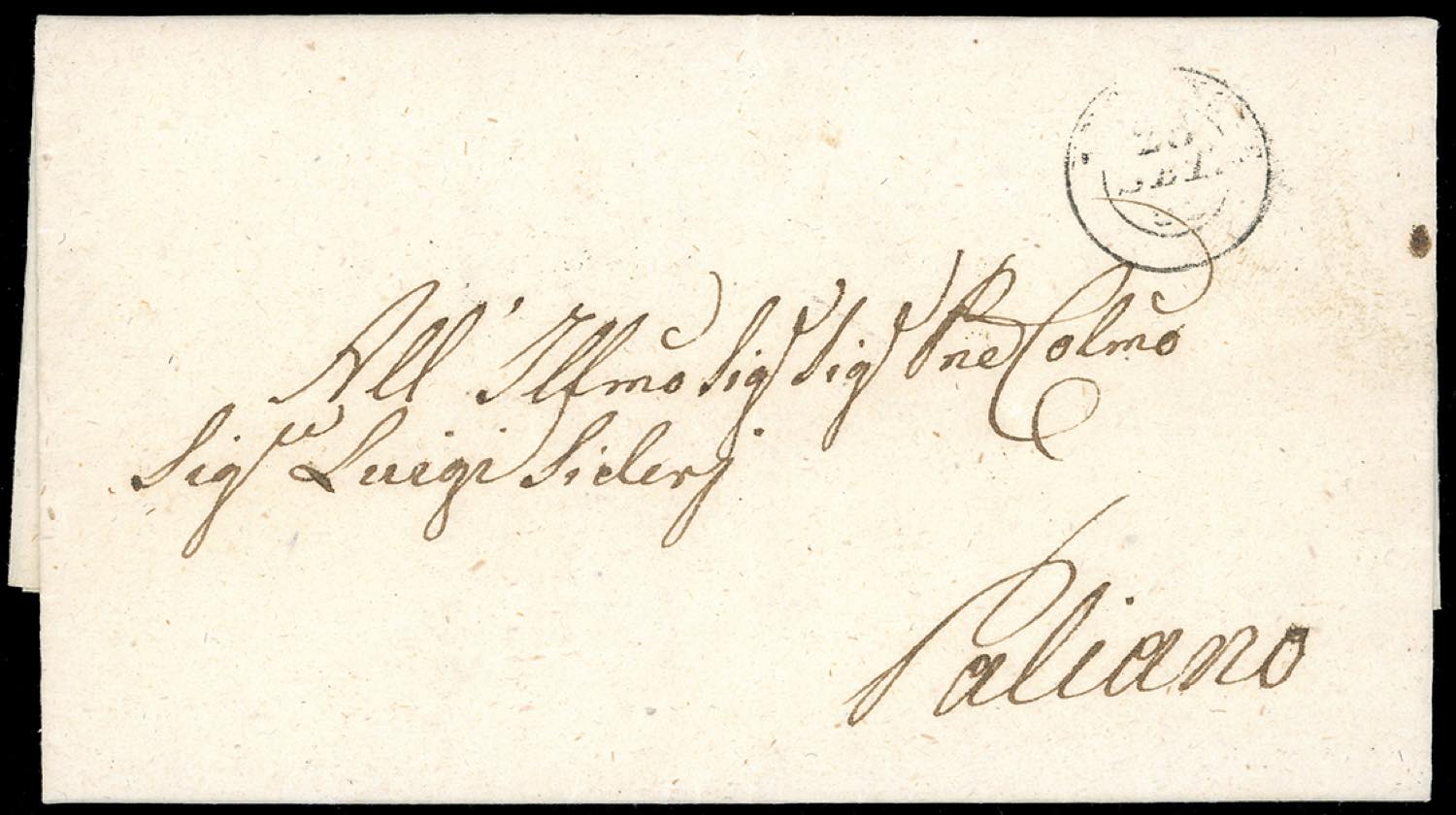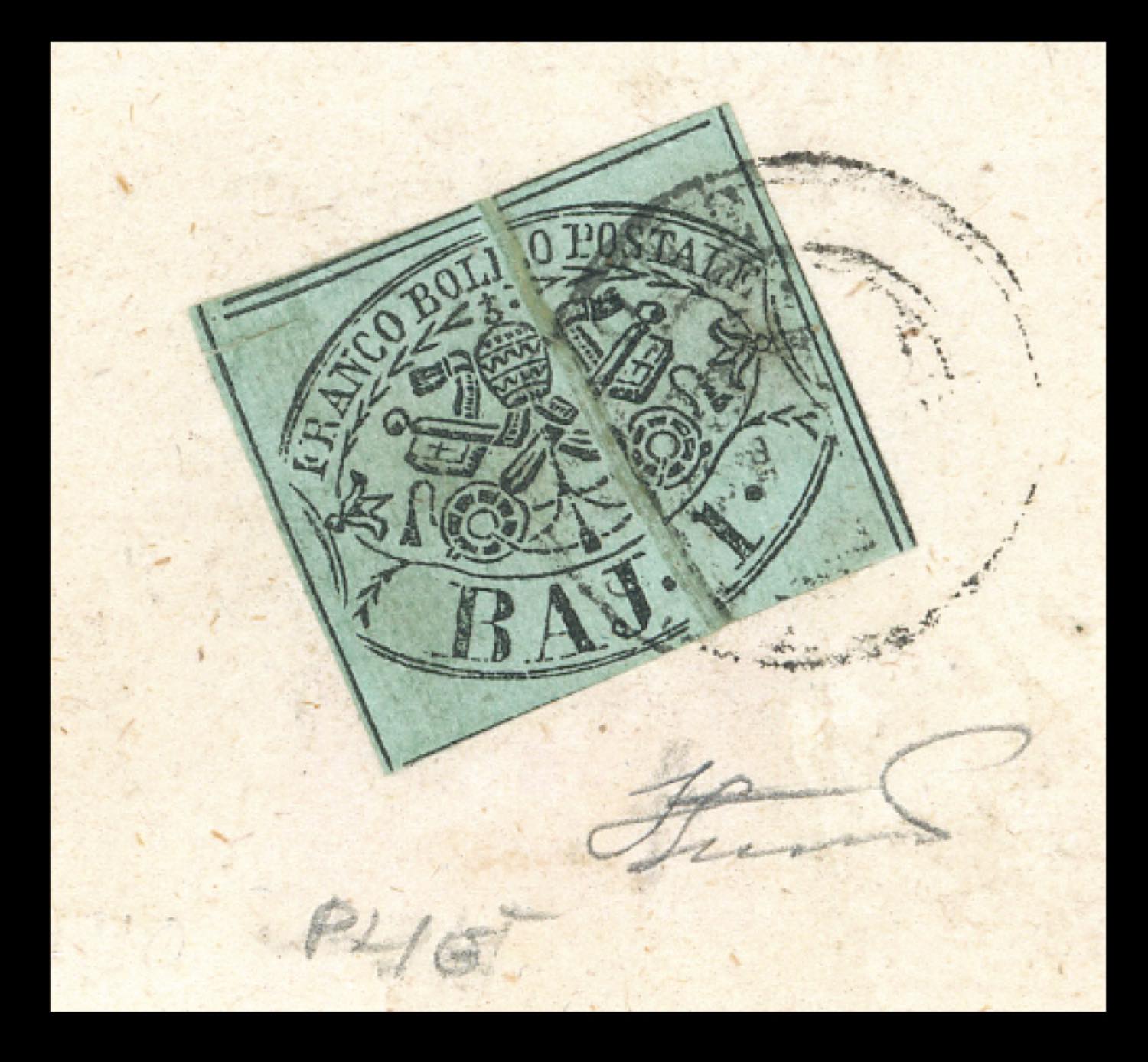 1852 - 1 baj verde grigiastro (2), varietà plì d'accordeon ben evidente, perfetto, al verso di lettera in porto assegnato da Frosinone 28/9/1852 a Paliano. Non comune e di ottima qualità. Ferrario.