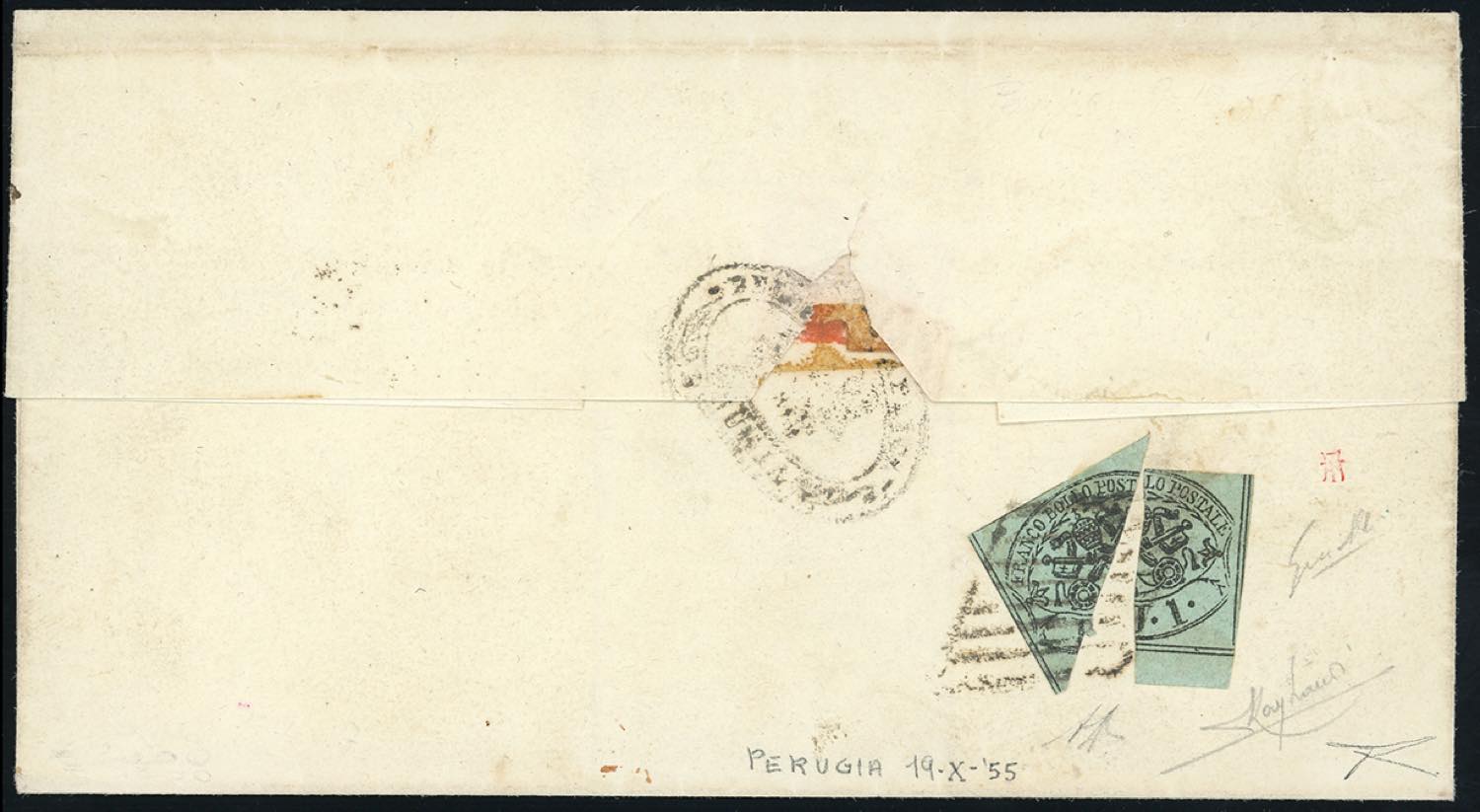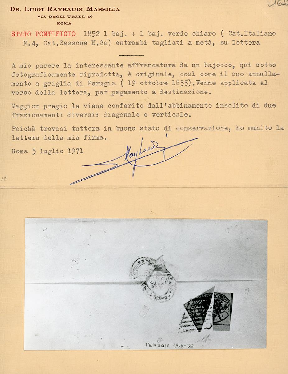 1857 - 1 baj verde grigiastro (2), due esemplari frazionati a metà, il primo in diagonale, il secondo verticalmente, perfetti, al verso di sovracoperta di lettera in porto assegnato da Perugia 19/10/1855 a Civitella di Todi. Combinazione di frazionamenti differenti molto rara! A.Diena, cert. Bottacchi e Raybaudi.
