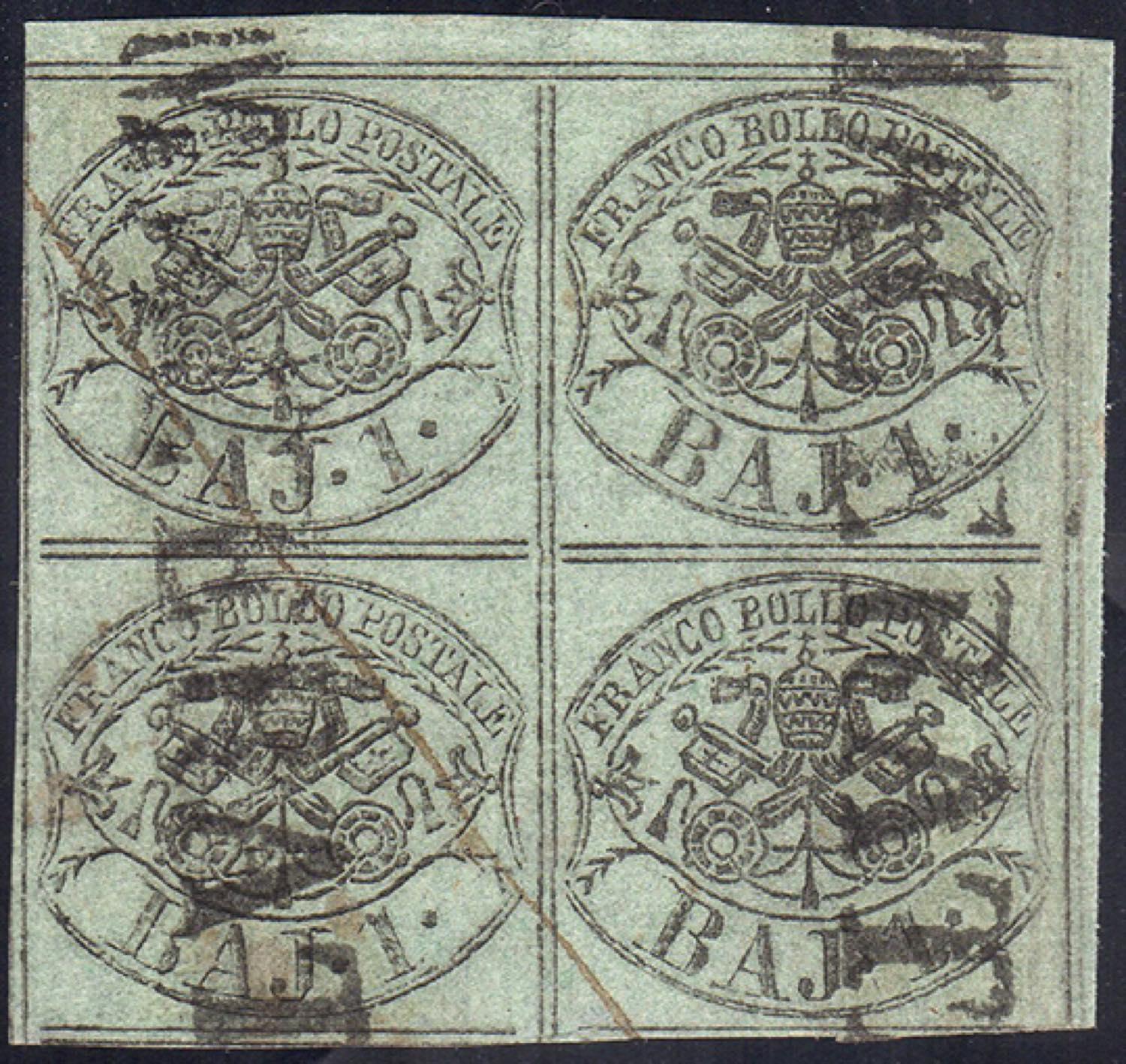 1854 - 1 baj verde grigiastro, inchiostro grigio oleoso (2b), blocco di quattro, perfetto, usato a Macerata. Molto bello! Cert. E.Diena. Ex coll. Andreotti.