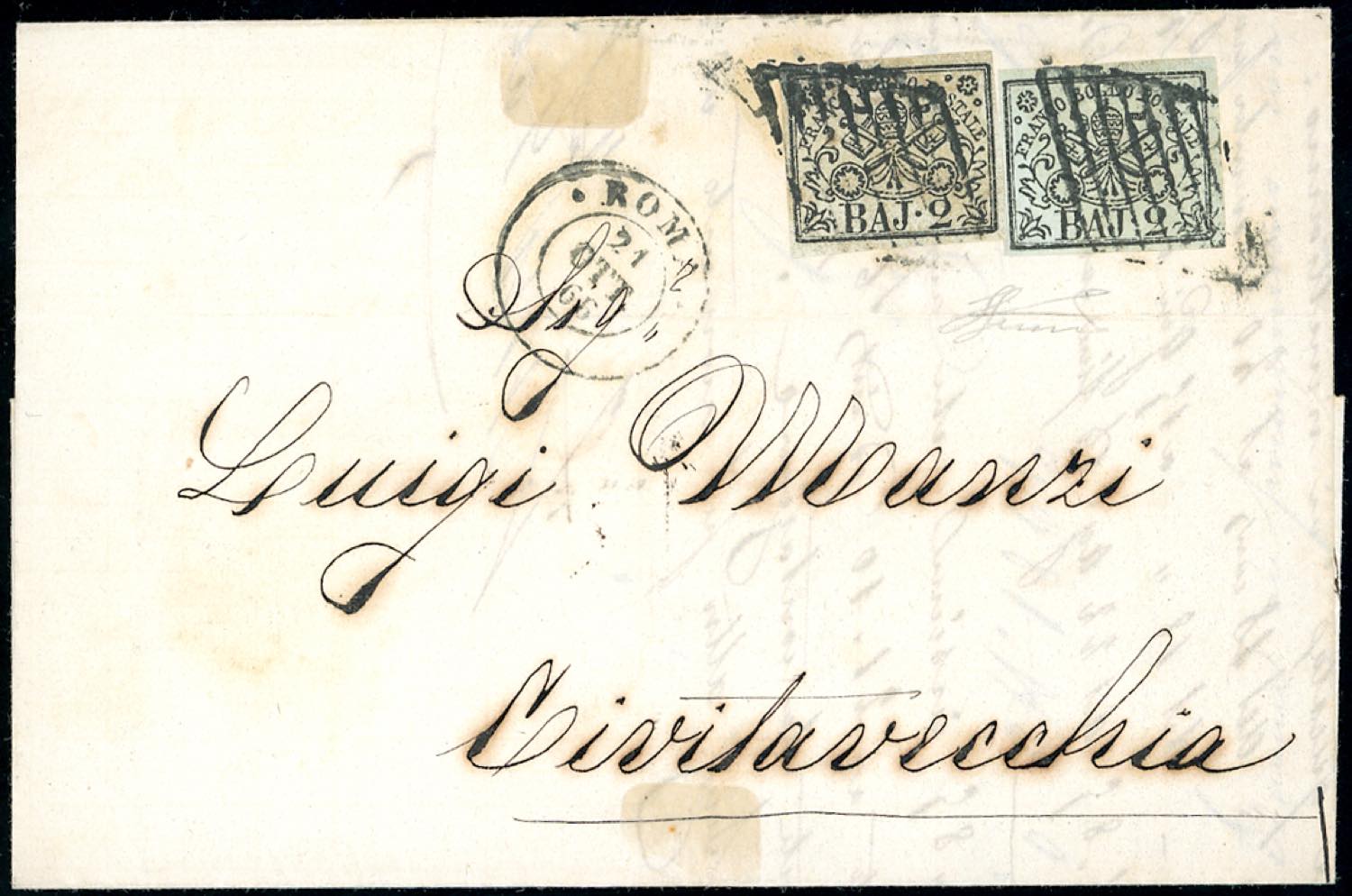 1866 - 2 baj bianco verdastro, 2 baj grigio azzurrastro (3Aa,3Ab), perfetti, su lettera da Roma 21/10/1866 a Civitavecchia. Bella e rara ... Read more