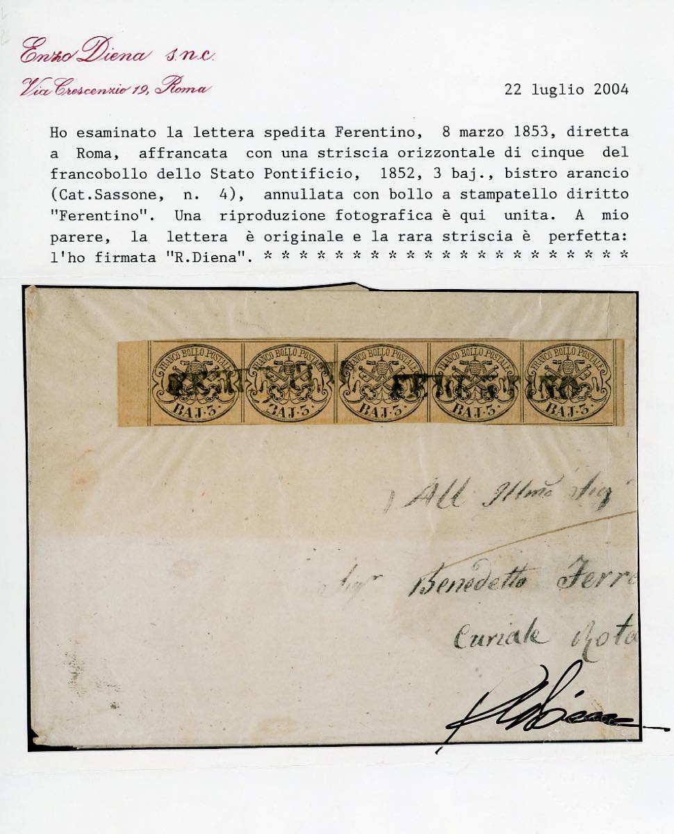 1853 - 3 baj bistro arancio (4), striscia orizzontale di cinque, bordo di foglio nei due lati verticali, perfetta, su sovracoperta di lettera da Ferentino a Roma 9/3/1853. Molto rara e di ottima qualità. Cert. Diena.
