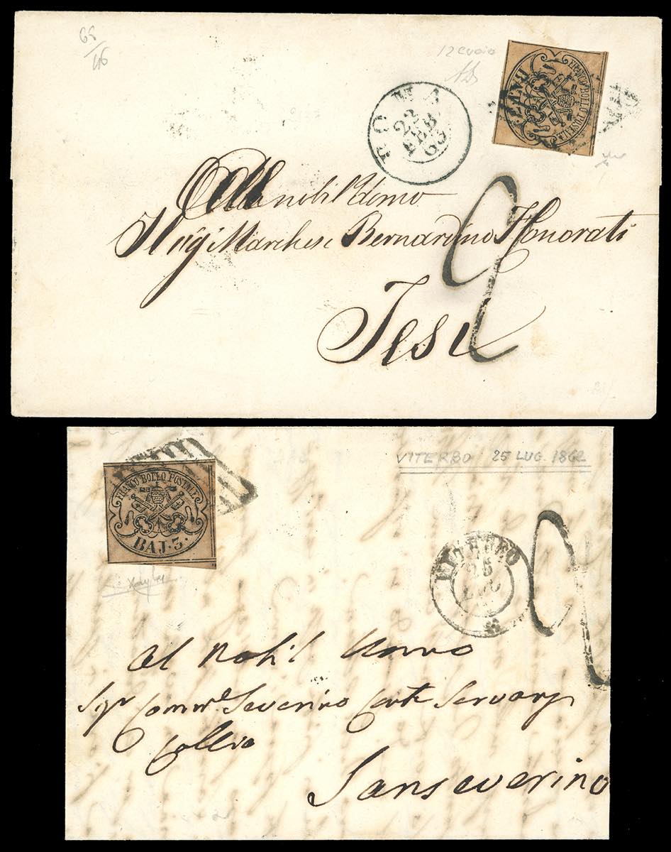 1862/63 - 3 baj bruno cuoio, due esemplari, uno chiaro ed uno scuro (4Ac,4Aca), perfetti, su altrettante lettere per il Regno d'Italia, tassate 20 cent. Tinte non comuni. Raybaudi/A.Diena e Chiavarello. Ex coll. Imperato.