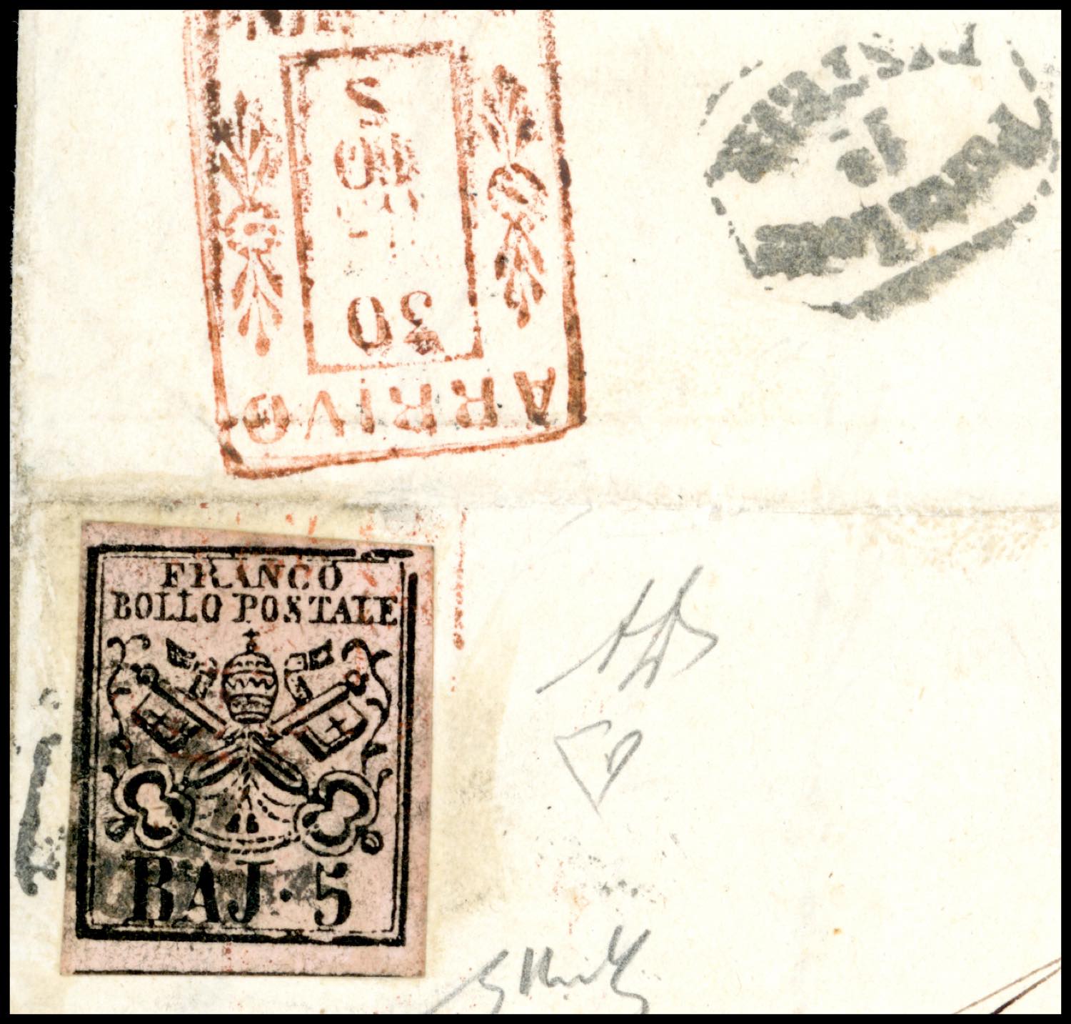 1863 - 5 baj rosa carminio (6A), perfetto, su testatina di lettera con parte del verso da Roma 19/4/1863 a Napoli. Il francobollo non annullato in partenza, è stato annullato in arrivo a Napoli con il timbrino "Porta Lett. 1a distribuz.". UNICO CASO NOTO. A.Diena, Chiavarello, cert. E.Diena.