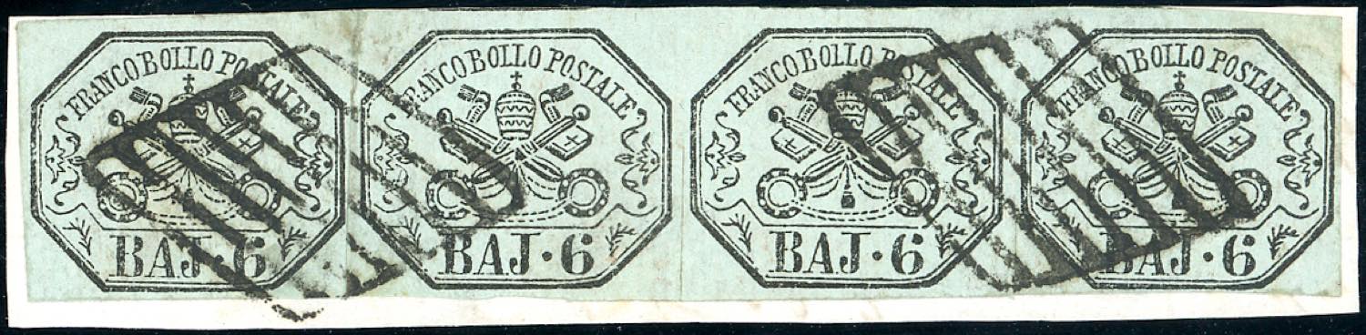 1852 - 6 baj grigio verdastro (7), strsicia orizzontale di quattro, perfetta, usata su piccolo frammento. Sorani, Chiavarello. Ex coll. ... Read more