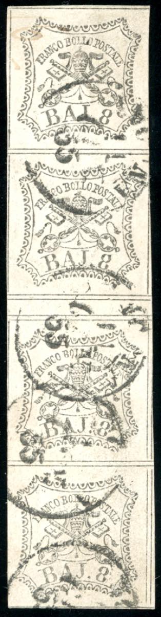1854 - 8 baj bianco, stampa con inchiostro grigio oleoso (9a), striscia verticale di quattro, interspazio di gruppo al centro, perfetta, usata ad Ancona 1/1/1855. Bella! A.Diena, cert. Diena (cat. Sassone ca. € 5.000 in proporzione).