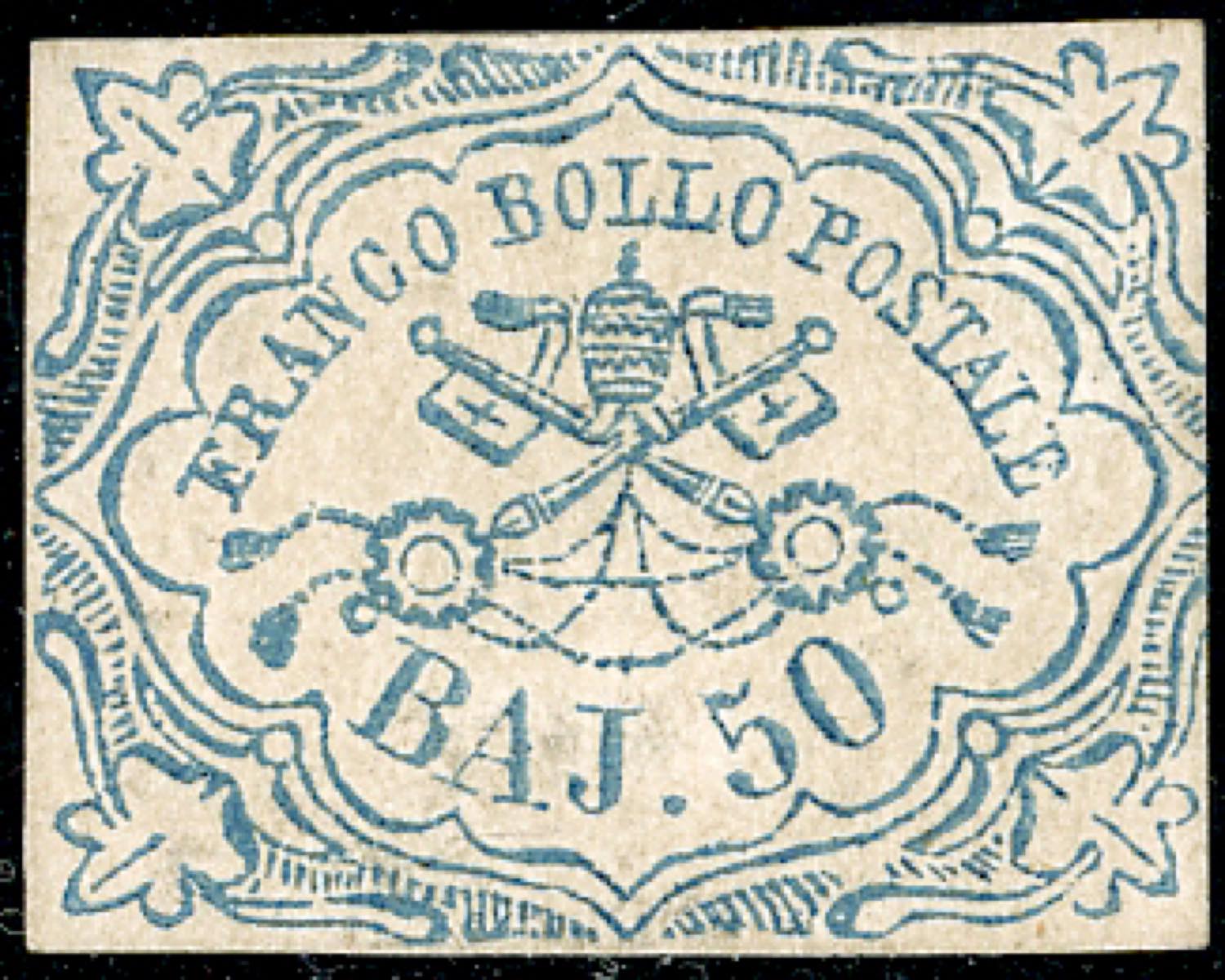 1852 - 50 baj azzurro (10), nuovo senza gomma, leggermente intaccato a destra. Cert. Chiavarello.