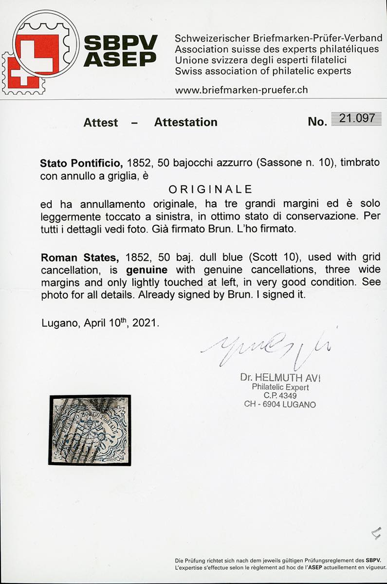 1852 - 50 baj azzurro (10), tre ampi margini, leggermente intaccato a sinistra, usato. Ottimo aspetto. Cert.Avi.