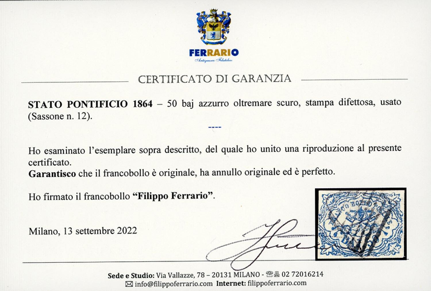 1864 - 50 baj azzurro oltremare scuro, stampa difettosa (12), usato, perfetto. Bello. Em.Diena, Fiecchi, cert. Ferrario.