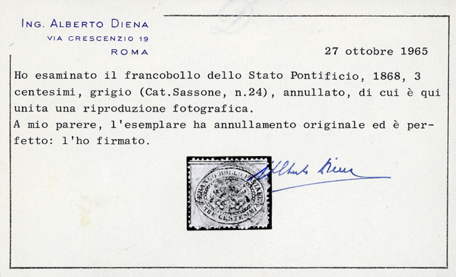 Lot 478 - 1868 - 3 cent. grigio (24), usato, perfetto. Cert. A.Diena.