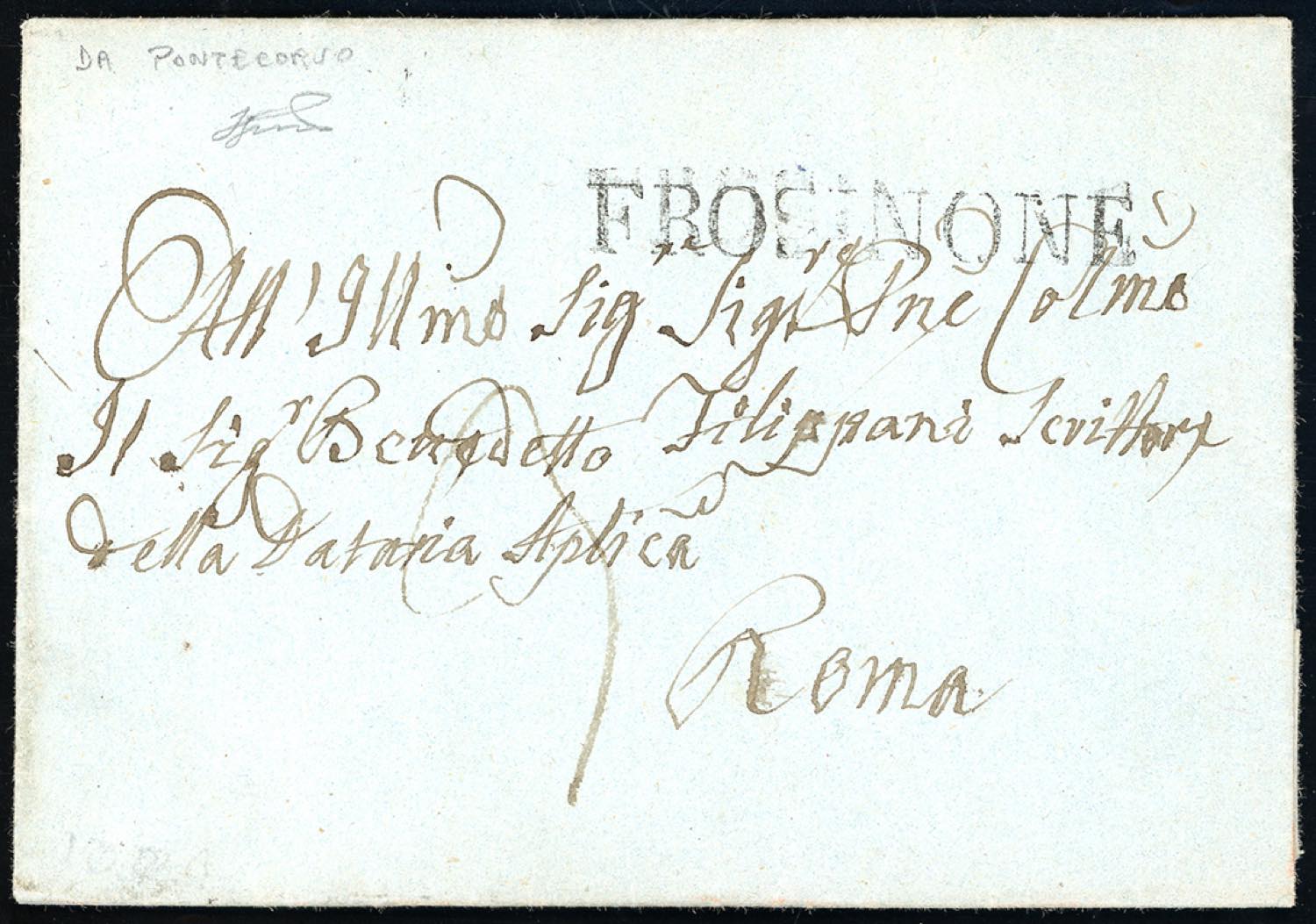 1833 - Lettera prefilatelica da Pontecorvo 13/9/1833, insolitamente senza il bollo nominativo al verso, transito di Frosinone sul fronte, a Roma, tassata 3 baj. Rare le corrispondenze prefilateliche dall'exclave pontificia nel Regno di Napoli, in periodo prefilatelico. Ferrario. Ex coll. Imperato.