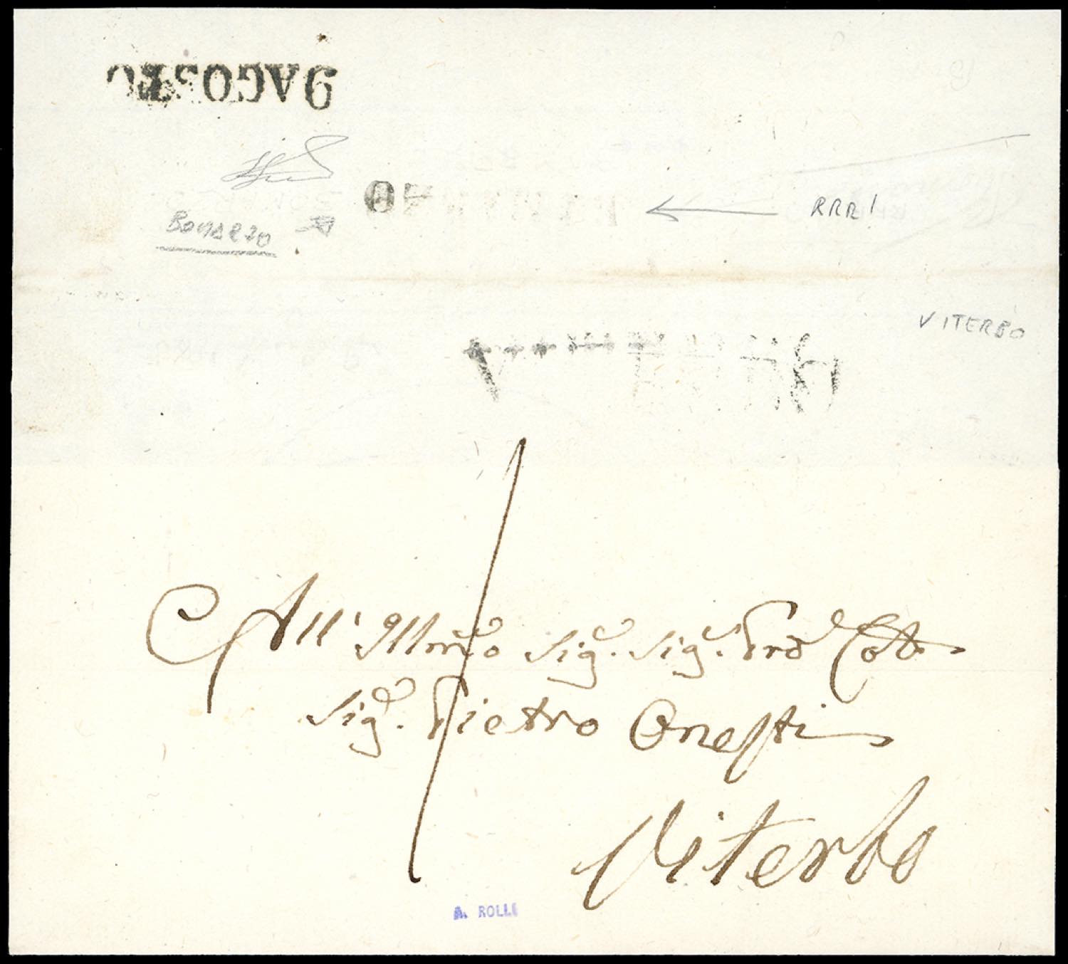 BOMARZO, lineare inedito - Fresca lettera in porto assegnato per Viterbo 9/8, tassata 1 baj, con al verso l'impronta parzialmente in albino dell'ufficio postale. Bollo ad oggi non catalogato, rarità del settore. Ferrario. Ex coll. Andreotti.