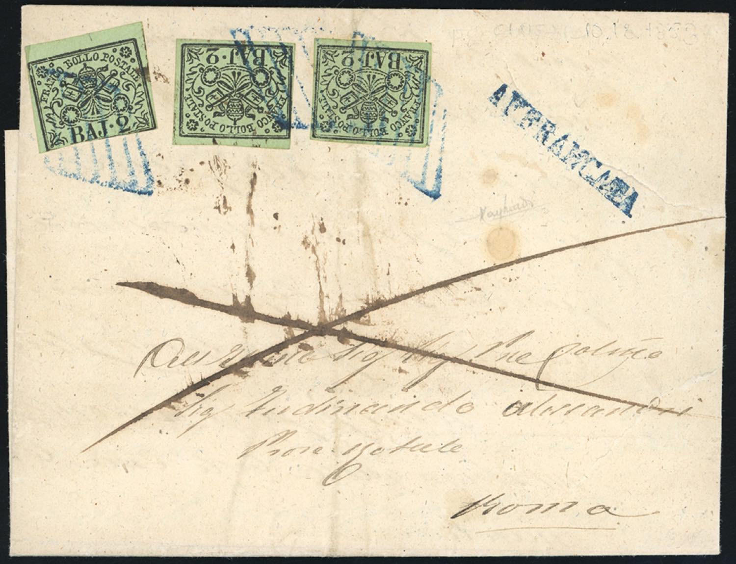 CANEMORTO, AFFRANCATA punti 12 - 2 baj (3), tre esemplari, due perfetti, uno corto in basso, su lettera del 10/12/1858 a Roma. Rara. ... Read more