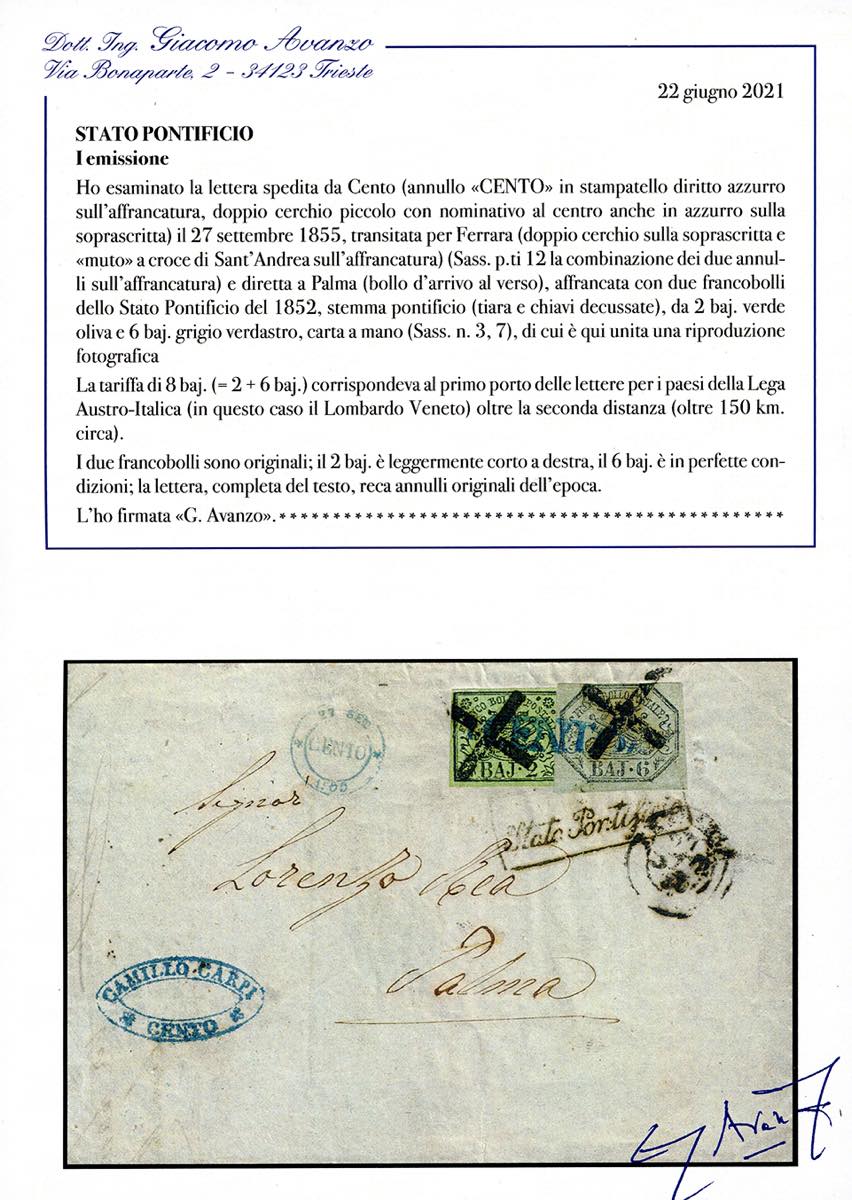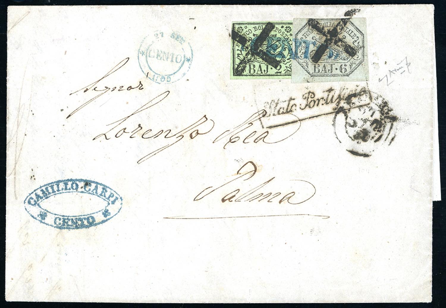 CENTO, SD azzurro + Croce di Sant'Andrea di Ferrara punti 12 - 2 baj, leggermente corto a destra, 6 baj, perfetto (3,7), su lettera del 27/9/1855 a Palma. Combinazione di annulli inedita e di prossima catalogazione. Cert. Avanzo.