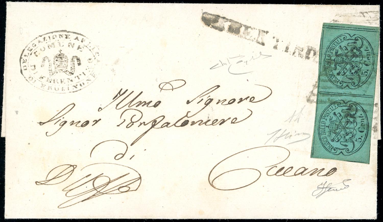 FERENTINO, punti 10 - 5 cent. (16), coppia perfetta, su sovracoperta di lettera per Ceccano 4/10/1868. Bella! A.Diena, Raybaudi, Ferrario.