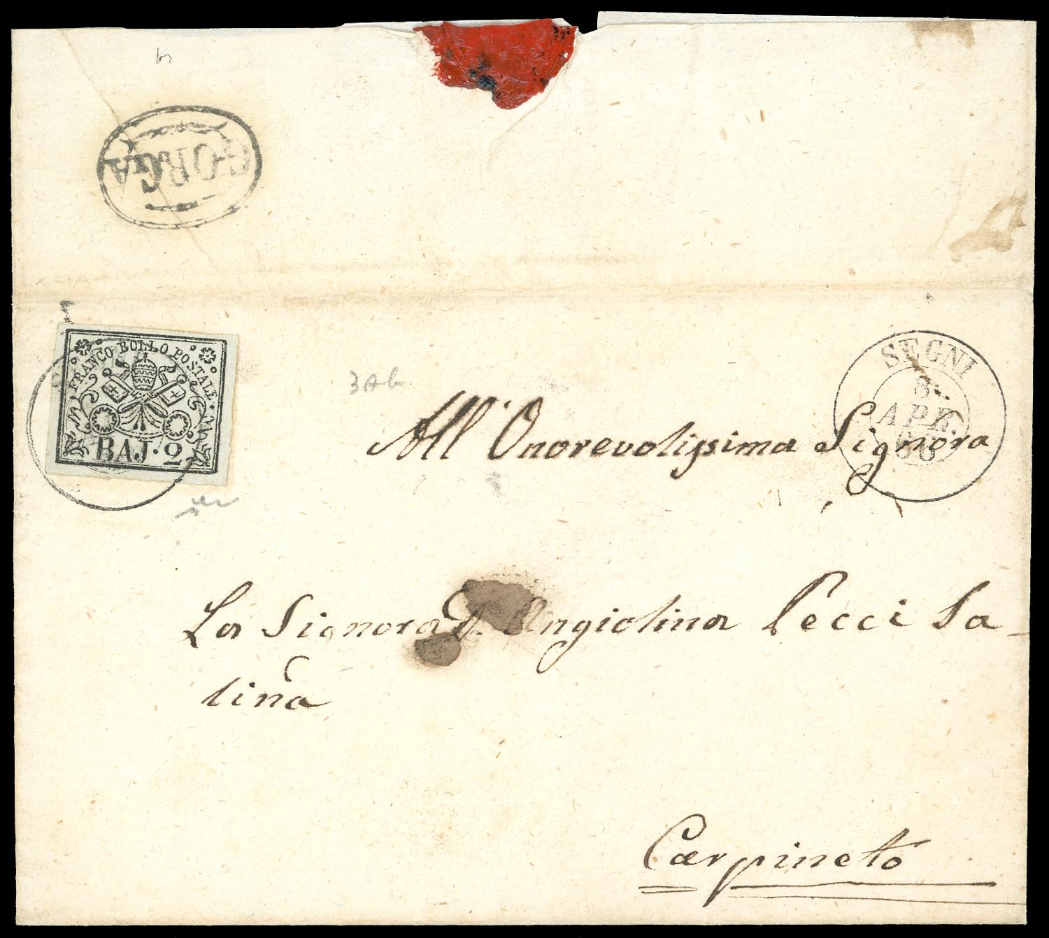 GORGA, ovale punti 7 - 2 baj (3Ab), su lettera per Carpineto, bollo di transito di Segni annullatore dell'8/4/1866. Impronta al verso della ... Read more