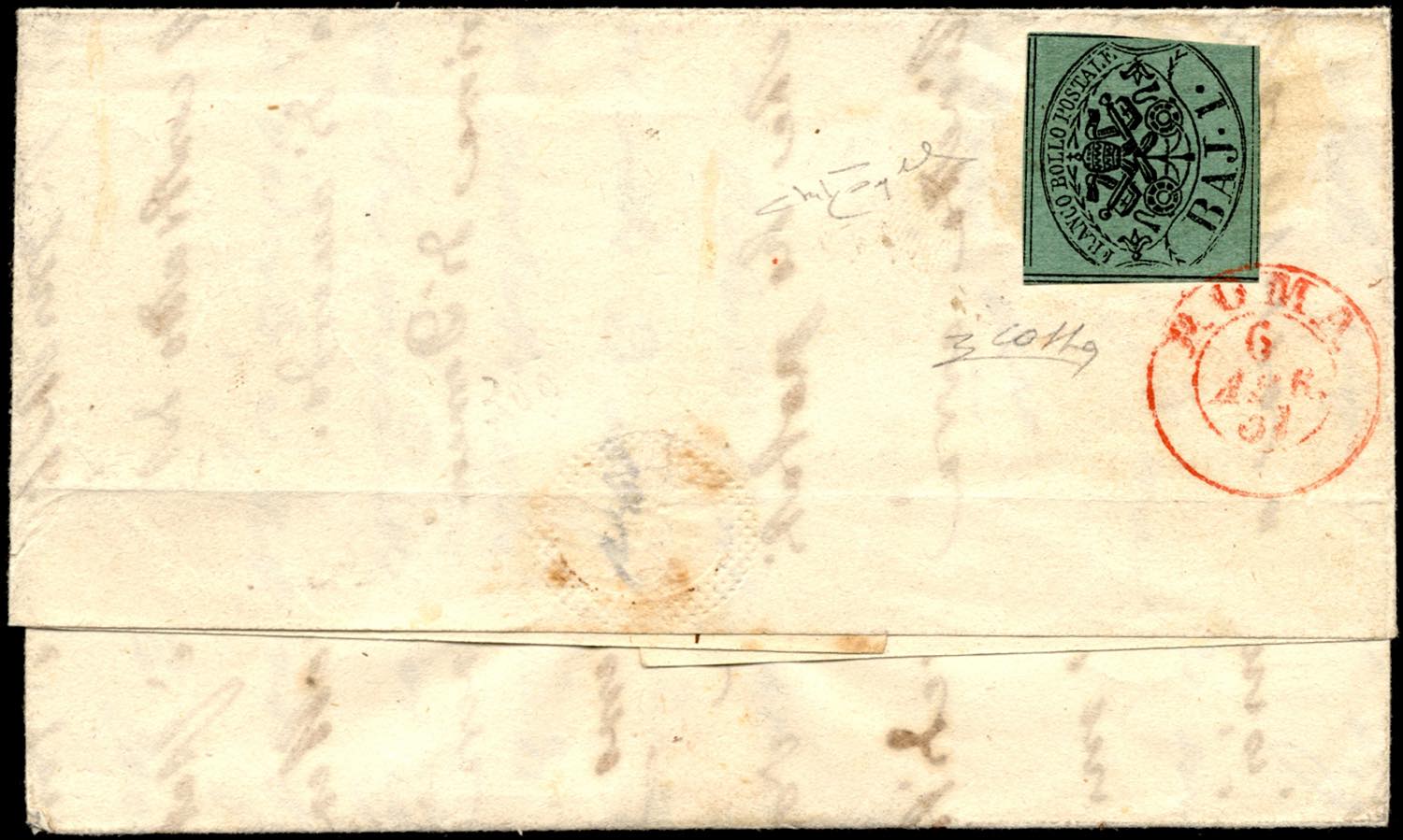 ROMA, rosso punti 12 - 1 baj (2a), perfetto, al verso di lettera da Nepi 6/4/1857 per Roma tassata 1, annullato in arrivo. Insieme bello e ... Read more
