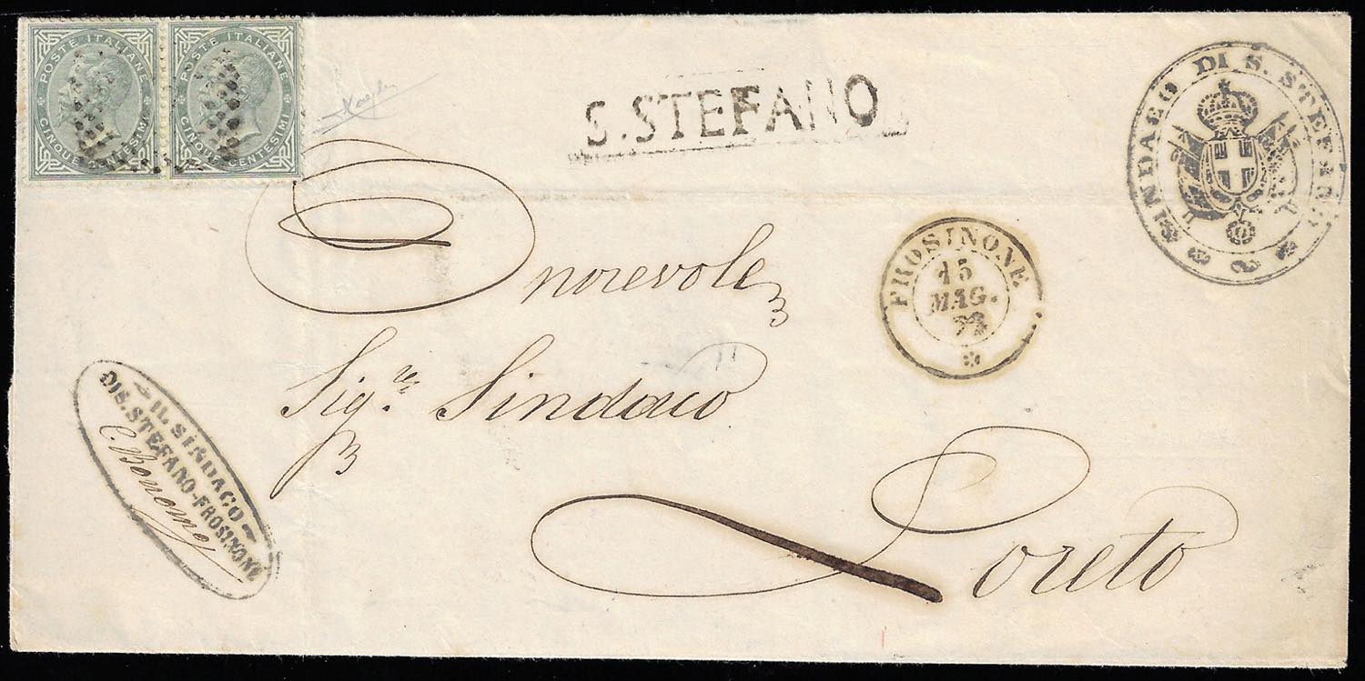 S.STEFANO, punti 10 - 5 cent. De La Rue (T16), due esemplari, perfetti, su sovracoperta di lettera del 15/5/1872 per Loreto.
