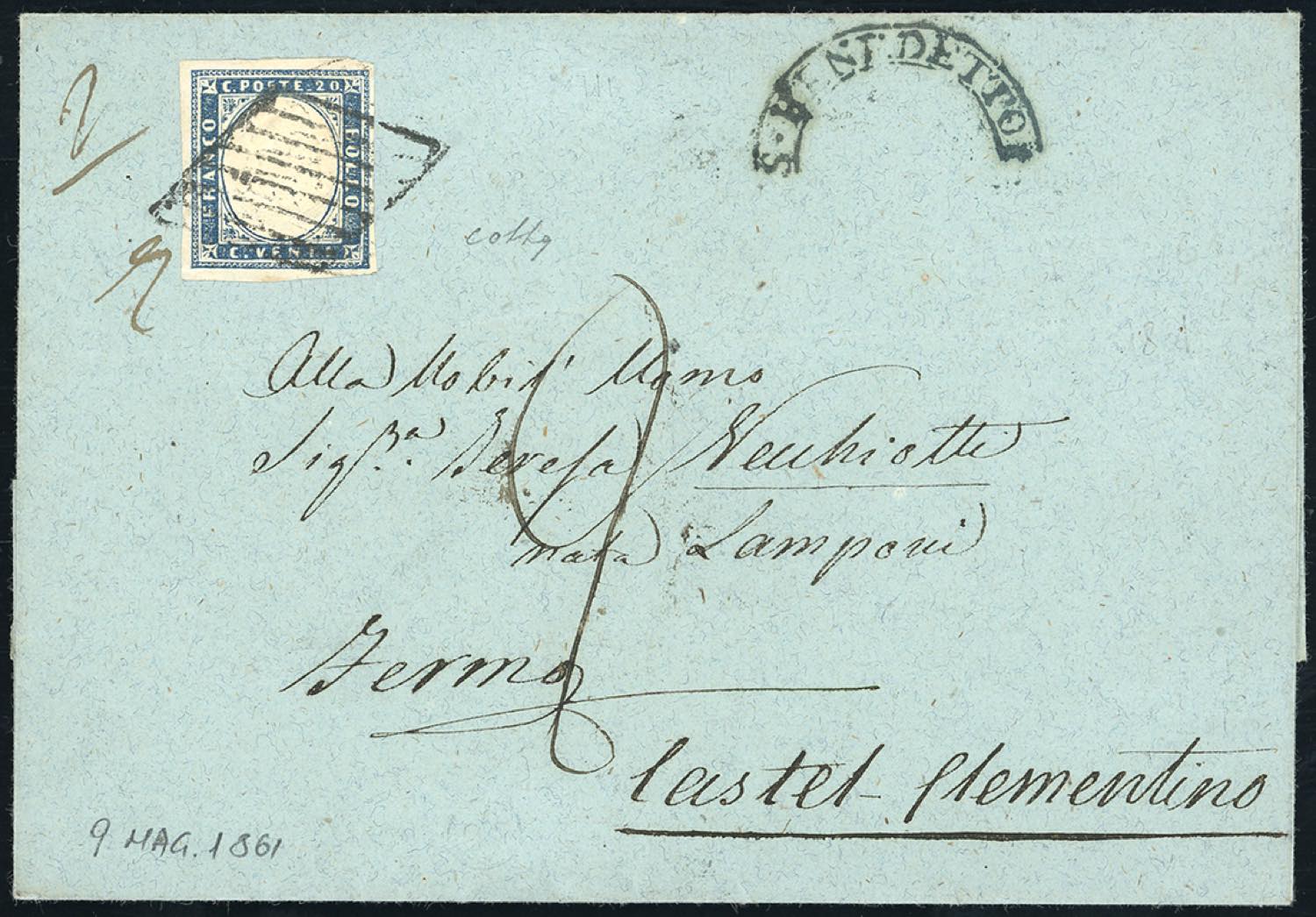 SAN BENEDETTO, cartella curvilenea in nero azzurrastro punti 13 - 20 cent. IV emissione di Sardegna (15Dc), perfetto, su lettera da Castel Clementino, al verso bollo di transito di Fermo 9/5/1861. Rara e molto bella. Cert. Colla.