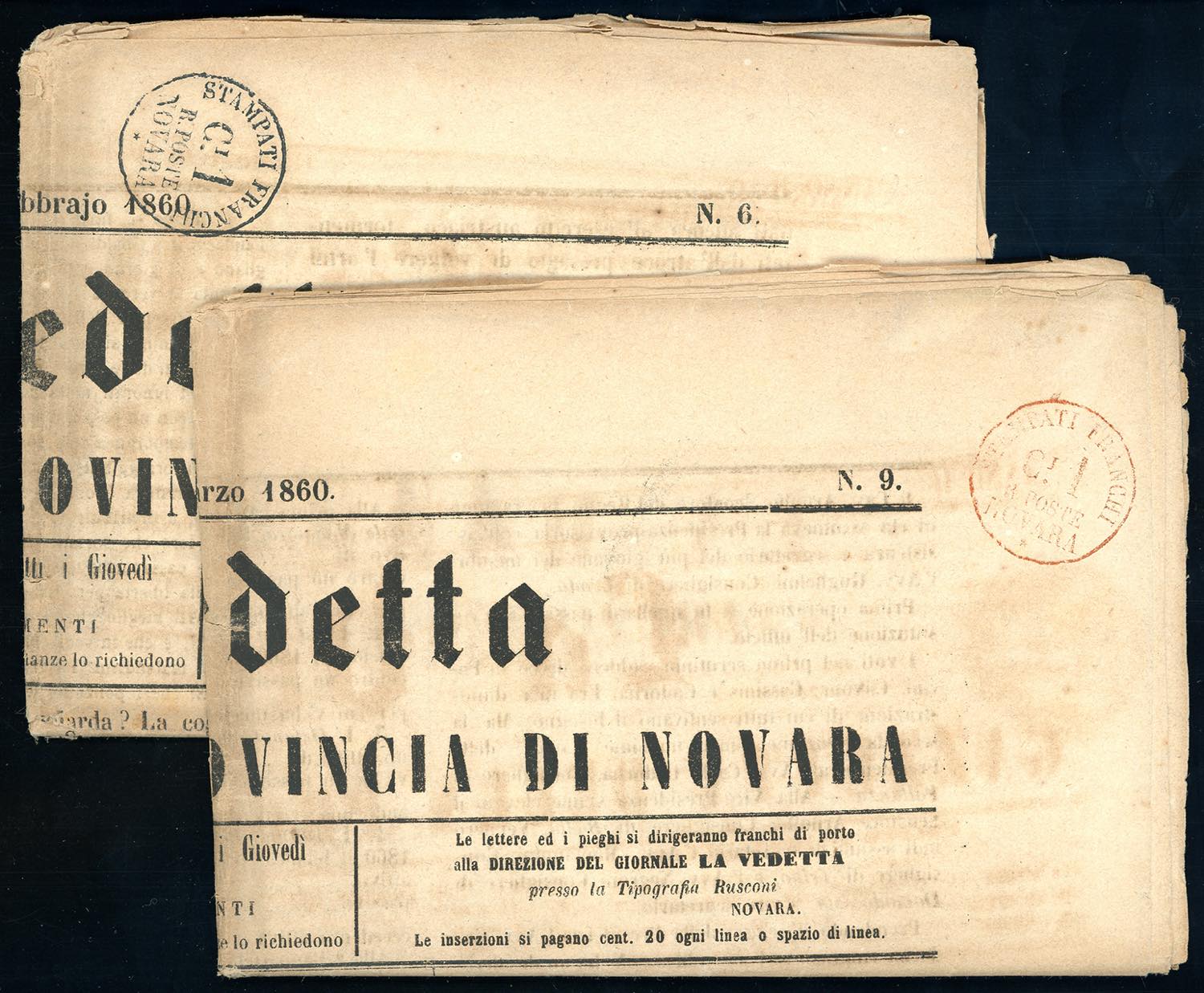 1860 - Due copie del giornale "La Vedetta", una del 9/2/1860, l'altra dell' 8/3/1860, entrambi con il bollo "C.1 Stampati franchi R. Poste Novara", in nero per la prima, in rosso per la seconda. Ex coll. Imperato.