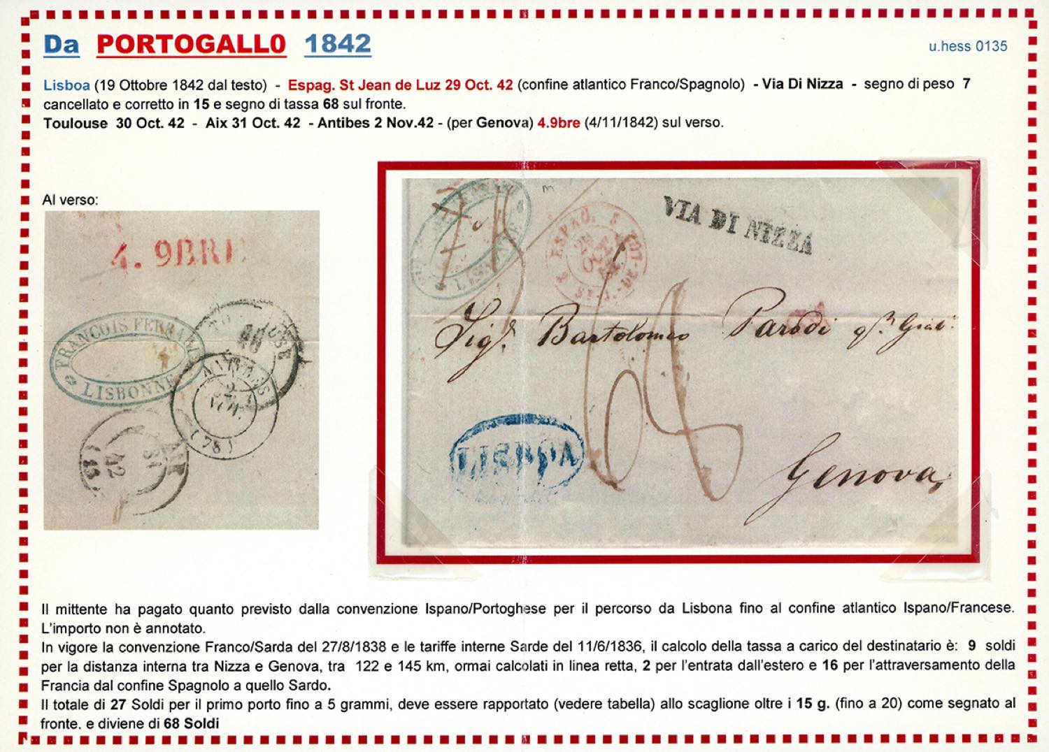 INCOMING MAIL PORTOGALLO 1842 - Lettera prefilatelica da Lisbona 10/10/1842 a Genova, sul fronte il lineare "via di Nizza", tassata in arrivo 68. Pregevole provenienza. Allegata dettagliata descrizione storico postale. Ferrario. Ex coll. Hess.