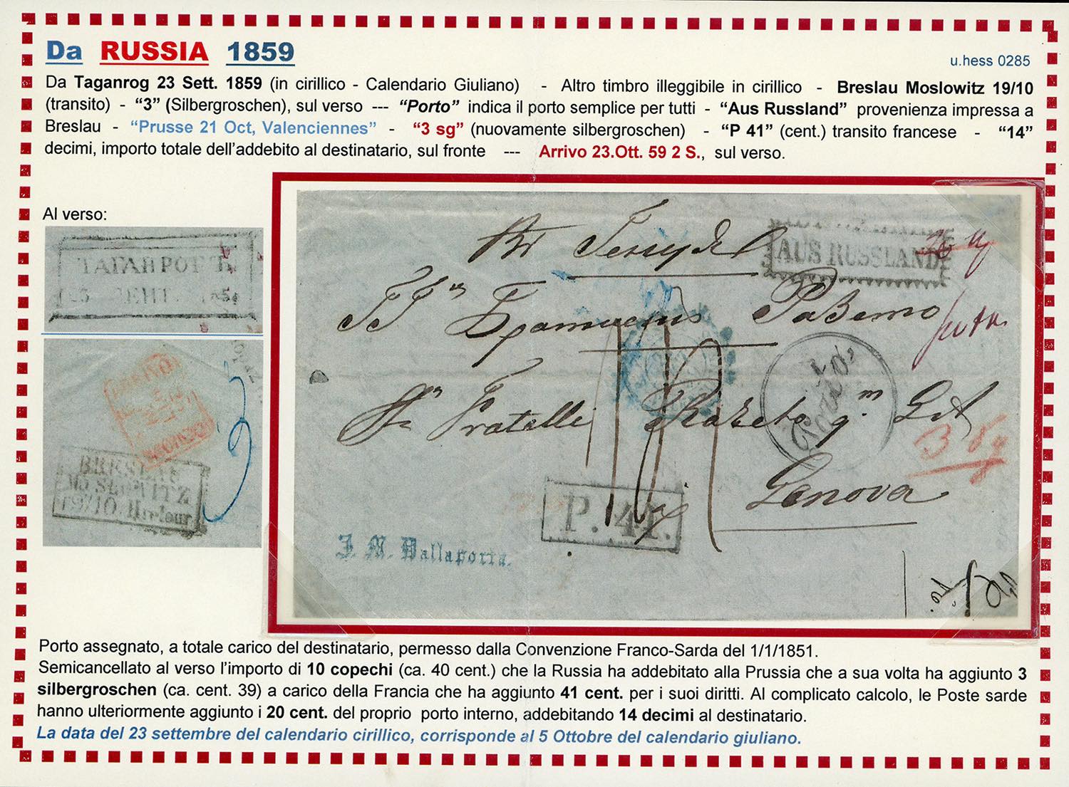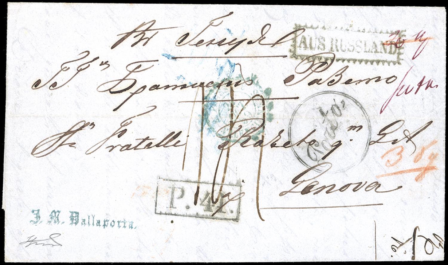 INCOMING MAIL RUSSIA 1859 - Lettera da Tanganrog 5/10/1859, sul mare d'Avoz, a Genova, tassata in arrivo 14 decimi, sul fronte e al verso numerosi segni di tassazione, dettagliamente illustrati nella descrizione storico postale allegata. Pregevole incoming mail. Ferrario. Ex coll. Hess.
