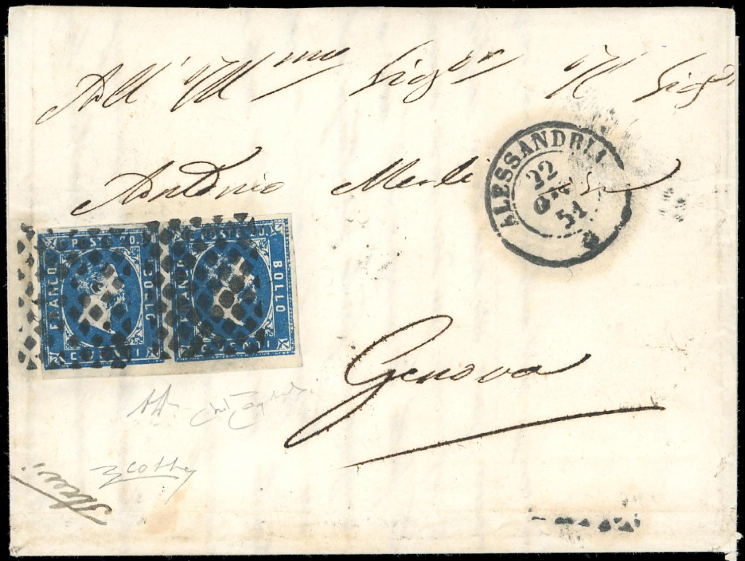 1851 - 20 cent. azzurro scuro, I tiratura (2c), coppia orizzontale, bordo di foglio in basso, perfetta, su lettera da Alessandria ... Read more