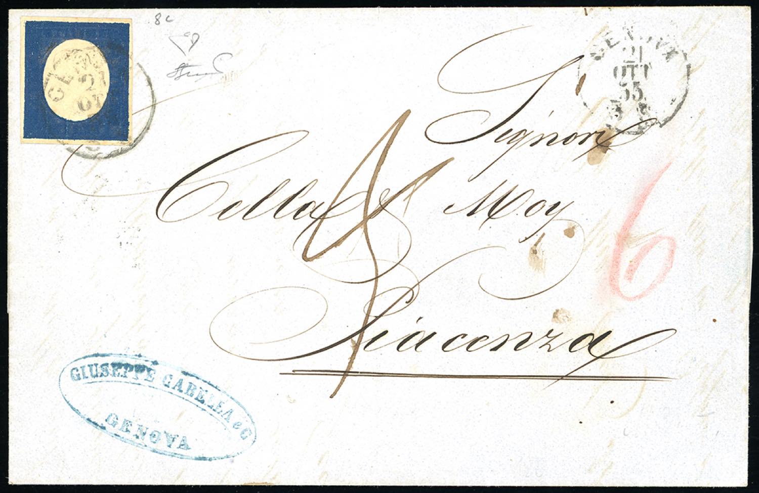 1855 - 20 cent. indaco (8c), perfetto e ben marginato, su fresca lettera da Genova 21/10/1855 a Piacenza, inizialmente tassata 30 cent., poi cassati e corretti in 60 cent. per il doppio porto, per il percorso interno del Ducato di Parma. Bella e rara. E.Diena, Ferrario. Ex coll. Imperato.