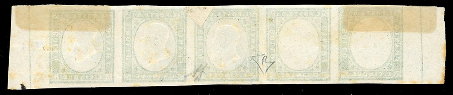 1863 - 5 cent. verde (13Ea), striscia orizzontale di cinque con margini non tosati mostranti le linee di riquadro verticali, i primi due esemplari senza effigie, lieve piega su due esemplari. Molto rara! A. ed E.Diena.