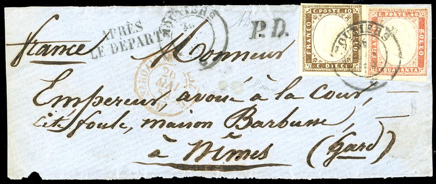 1859 - 10 cent., 40 cent., tinte del 1859, il 40 cent. con il margine destro rasente, su frontespizio di busta da Moutiers 24/5/1859 a Nimes. A.Diena.