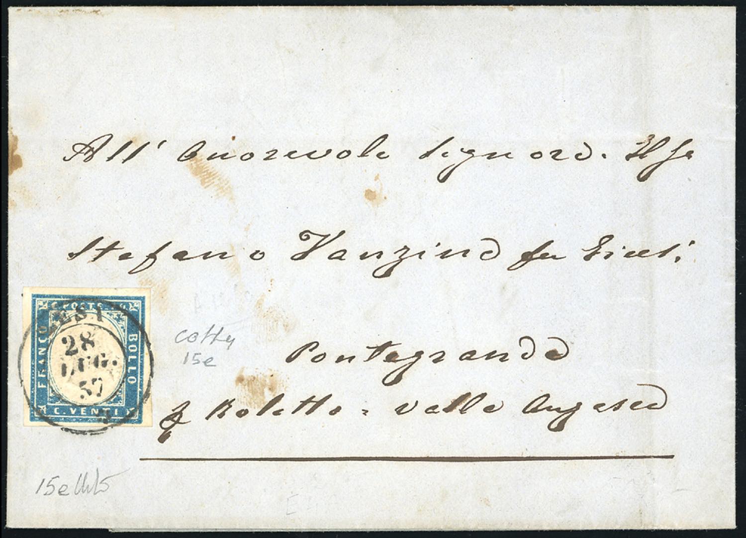 1857 - 20 cent. cobalto verdastro (15e), perfetto e ben marginato, su lettera da Lesa 28/7/1857 a Pontegrande. Pregevole tinta e molto ... Read more