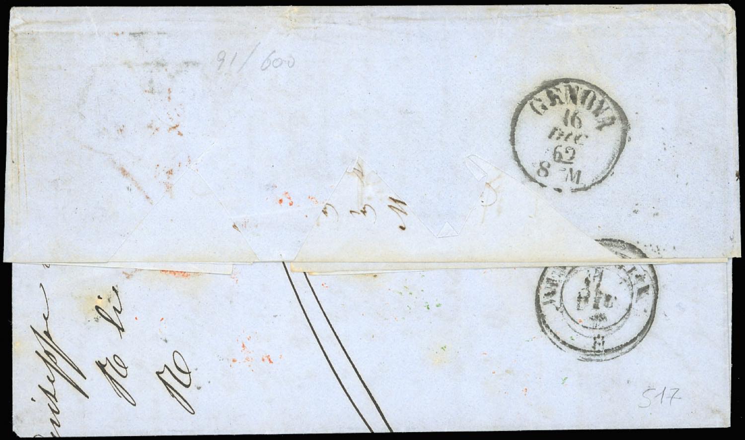 1862 - 20 cent. indaco (15E), striscia di tre, giusta a sinistra, e singolo, perfetto, su lettera di doppio porto da Bari 11/12/1862, ... Read more