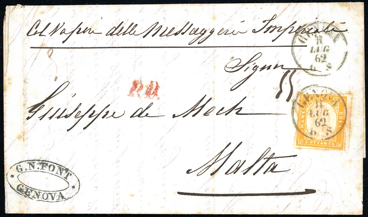 1862 - 80 cent. giallo arancio (17C), tagliato irregolarmente, isolato su lettera da Genova 11/7/1862 a Malta, in PD, manoscritto "Col ... Read more