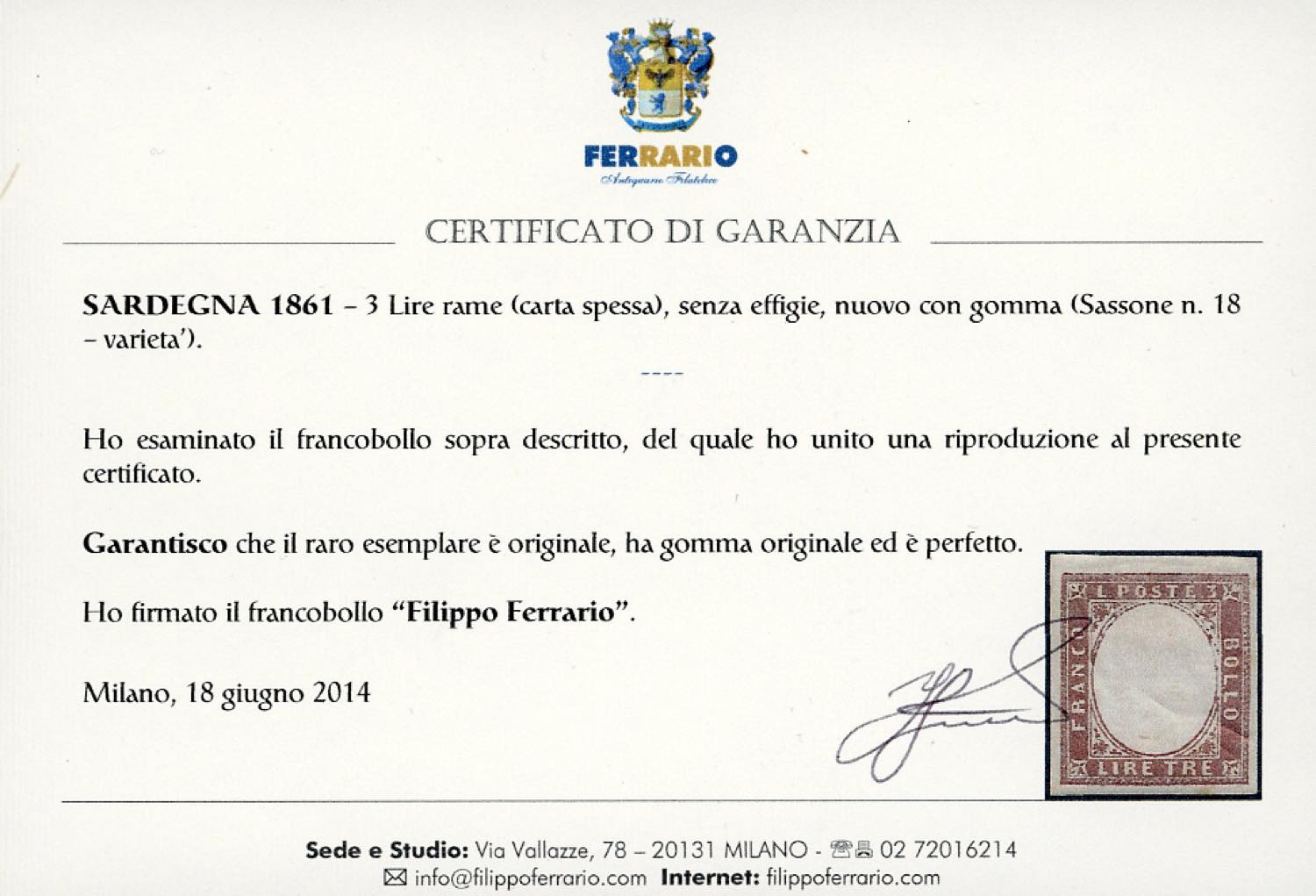 1861 - 3 lire rame vivo (18A), senza effigie, gomma originale, perfetto. Molto raro e non catalogato. Cert. Ferrario.