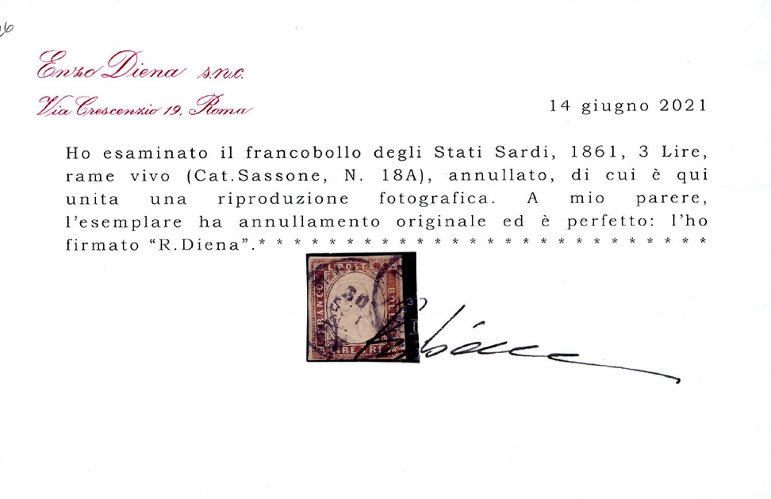 1861 - 3 lire rame vivo (18A), usato, perfetto. Molto bello. Chiavarello, Emilio Diena, cert. Diena e Ferrario. Ex coll. Imperato.