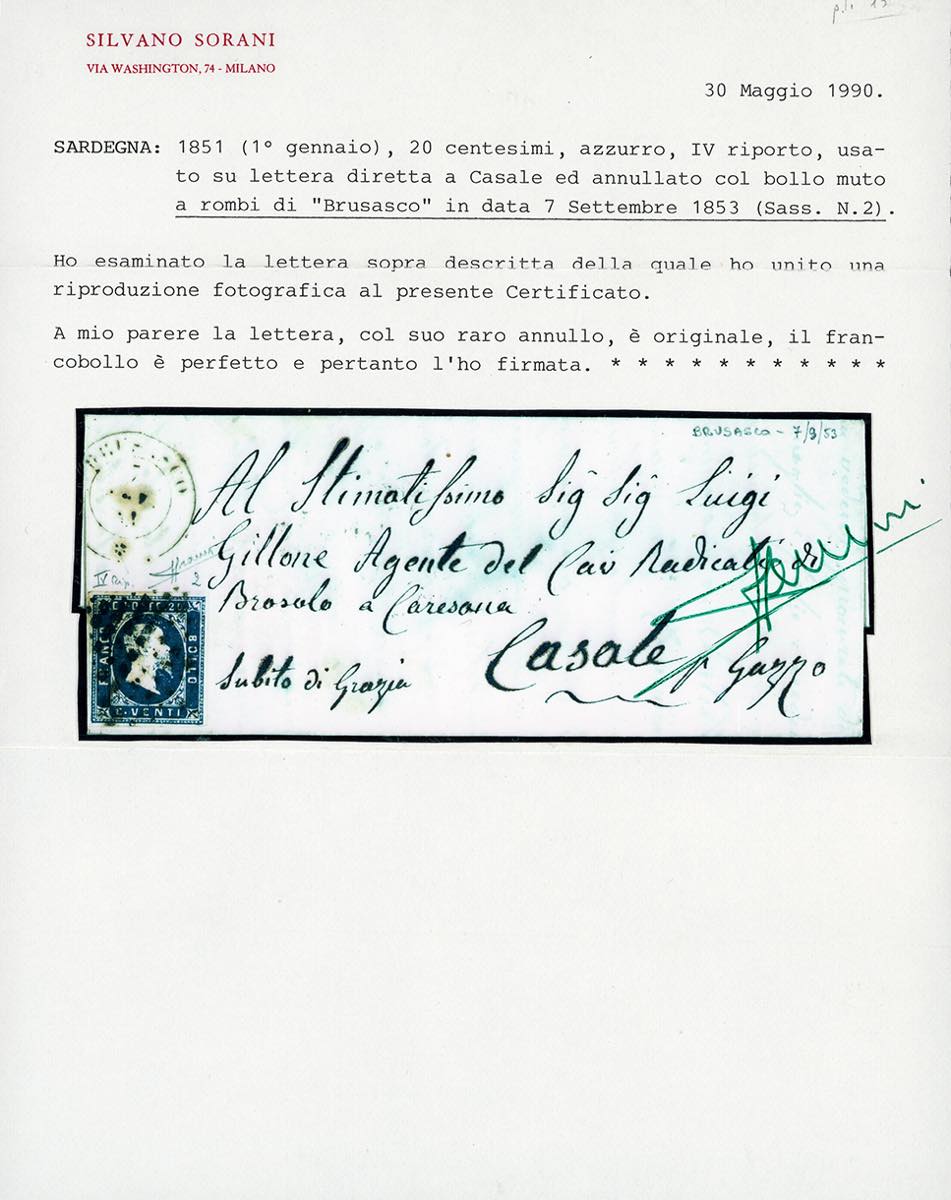 PIEMONTE-BRUSASCO, punti 13 - 20 cent. (2), perfetto, su lettera del 7/9/1853 per Casale. Rara. Cert. E.Diena e Sorani.