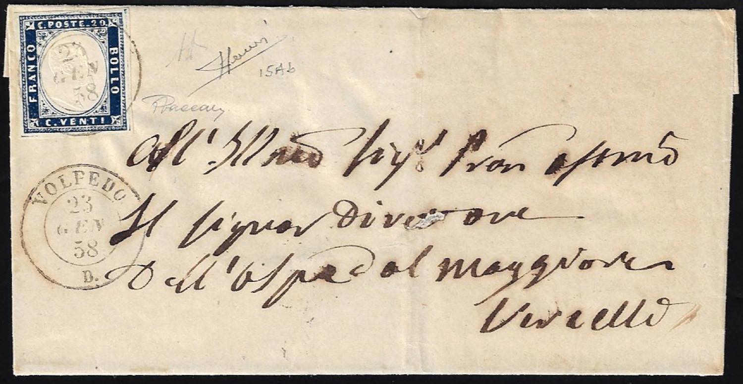 PIEMONTE-VOLPEDO, punti 8 - 20 cent. (15Ab), perfetto, su sovracoperta di lettera del 23/1/1858 per Vercelli. Bella. A.Diena, Vaccari, ... Read more