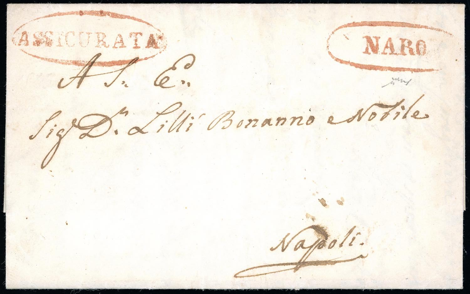 1842 - Fresca lettera assicurata da Naro 12/2/1843, ovali rossi, a Napoli, segni di tassa al verso. Ex coll. Imperato.