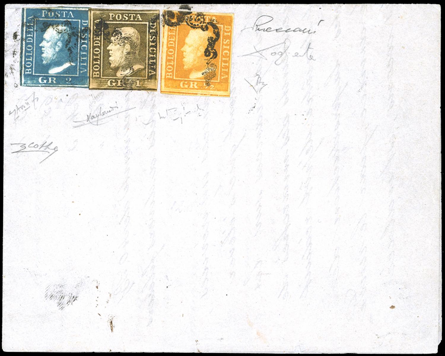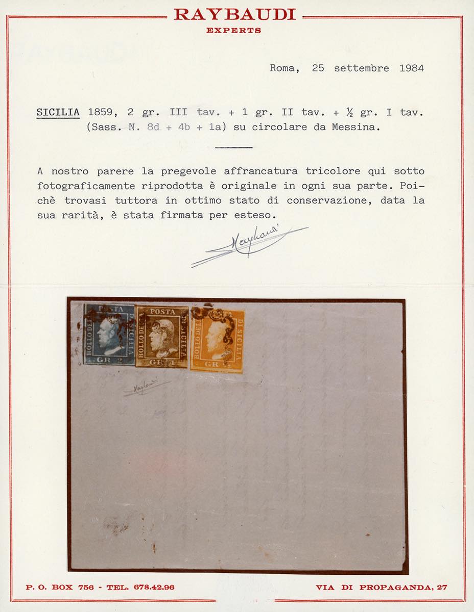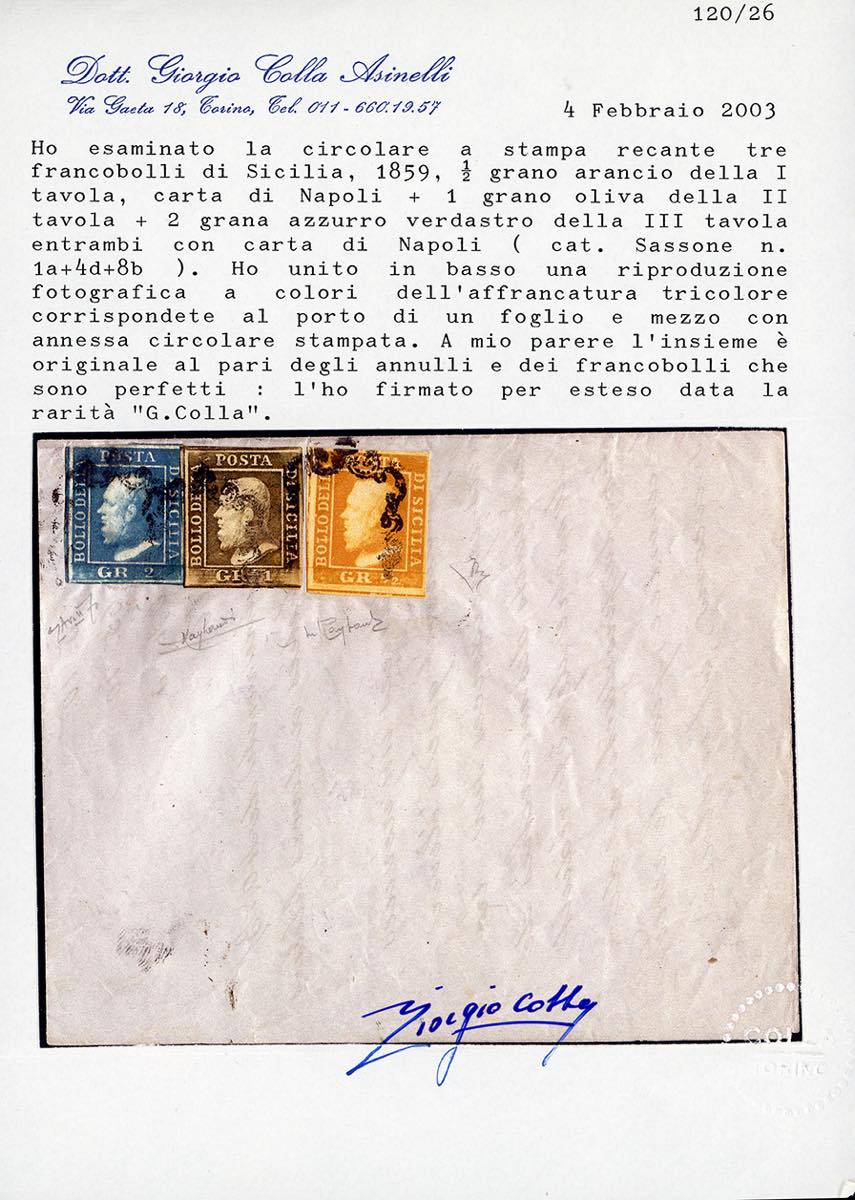 1859 - 1/2 grano arancio, I tavola, 1 grano oliva, II tavola, 2 grano azzurro verdastro, III tavola, tutti carta di Napoli (1a,4d,8b), perfetti, annullati con il bollo a ferro di cavallo su fresca circolare a stampa. Splendida e rarissima affrancatura tricolore, corrispondente ad una lettera di un foglio e mezzo con allegata una circolare a stampa. Si conoscono solo 3 lettere con la tariffa di 3 grana e 1/2. Da esposizione. Avanzo, E.Diena, Vaccari, cert. Colla e Raybaudi.