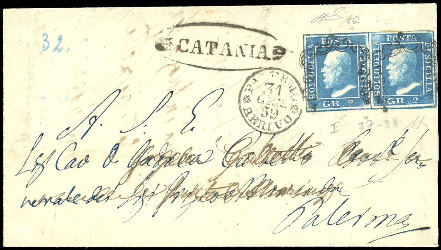 1859 - 2 grana cobalto, I tavola, carta di Napoli, due esemplari posiz. 37 e 38 (6b), perfetti, su fresca lettera da Catania a Palermo 31/1/1859. A.Diena, Ferrario. Ex coll. Imperato.
