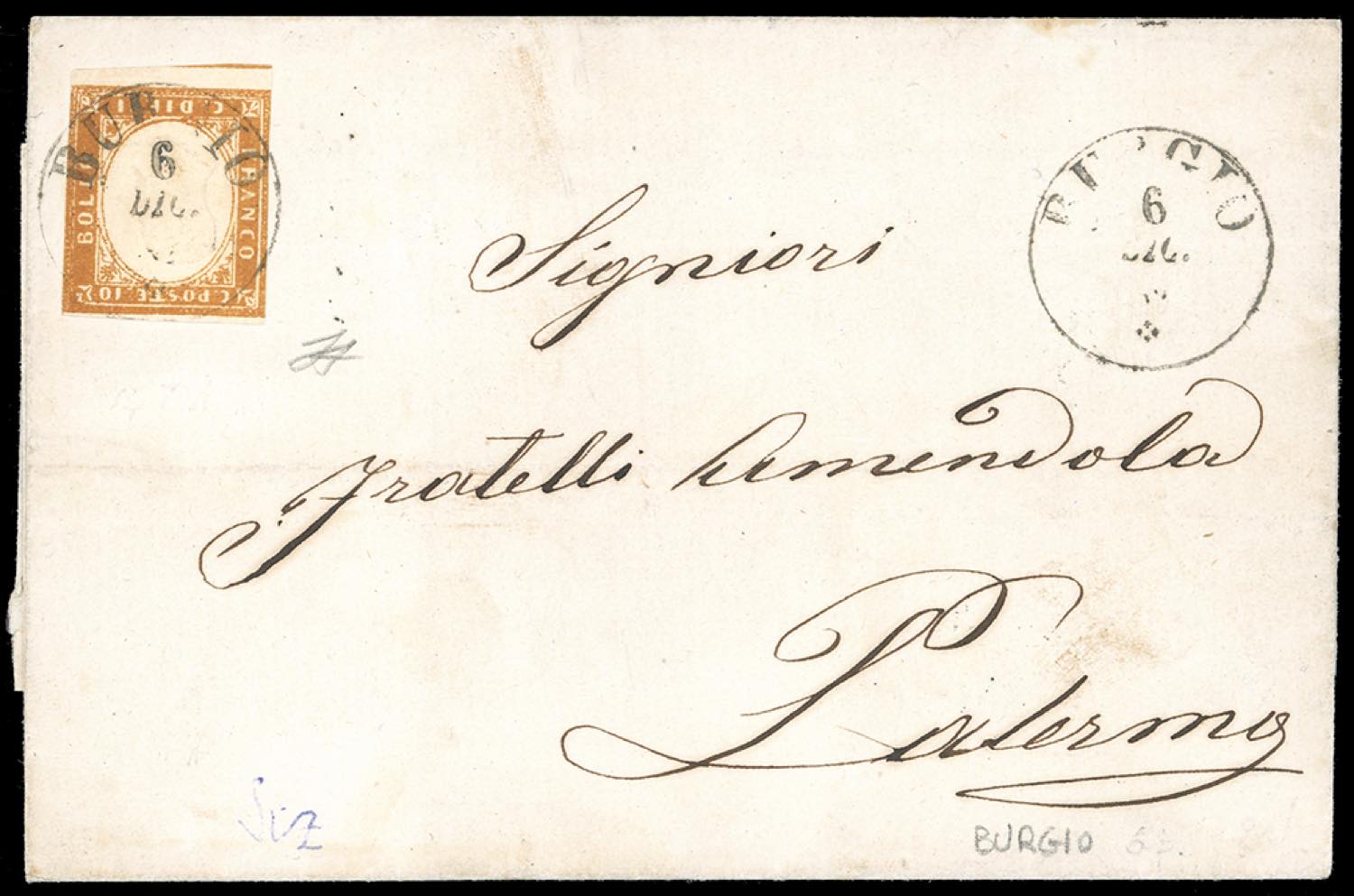 BURGIO, sardo italiano punti 3 - 10 cent. IV emissione di Sardegna (14Df), margini verticali rasenti, su fresca lettera del 6/12/1862 per Palermo. Ferrario.