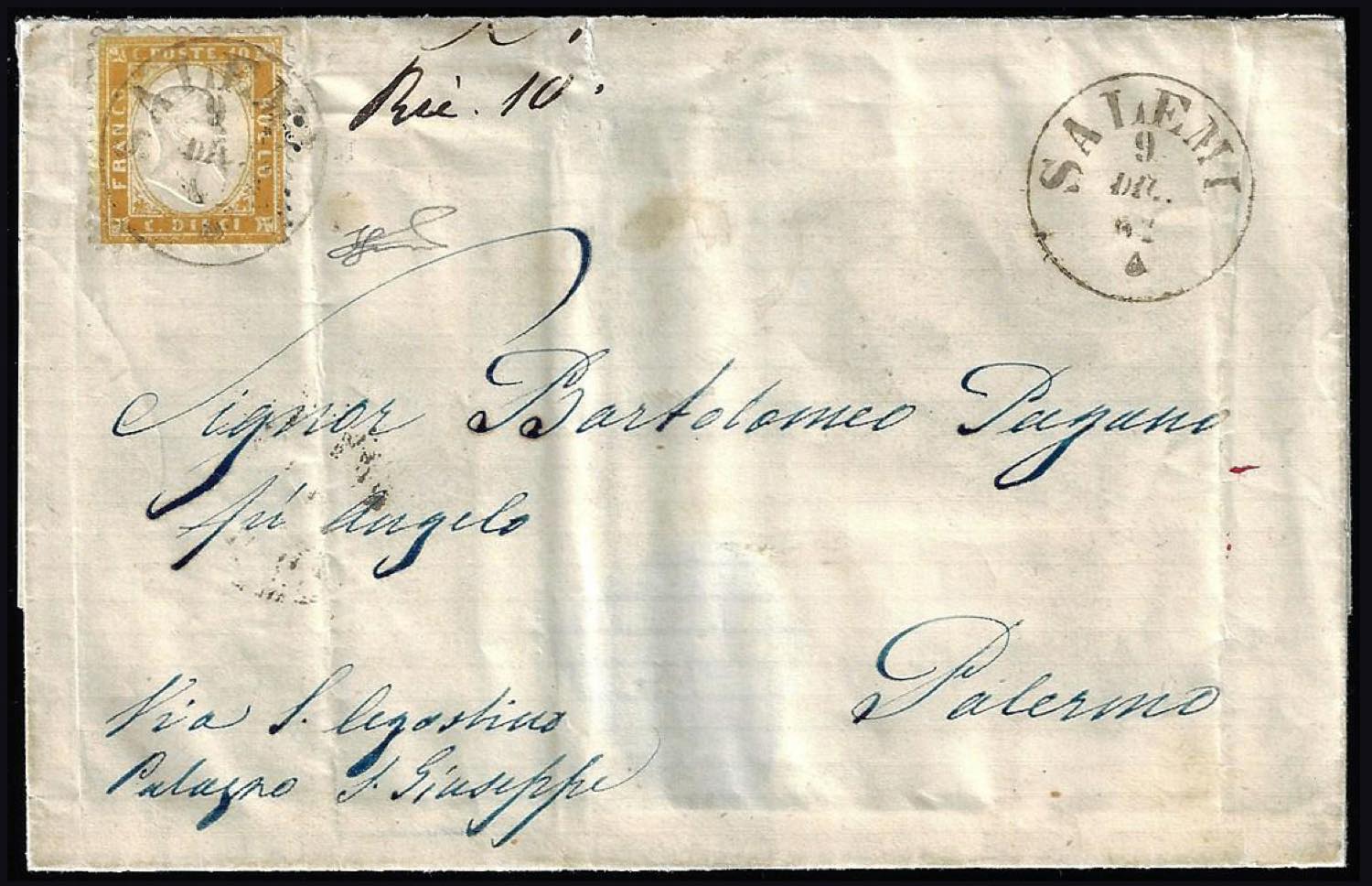 SALEMI, cerchio su Regno I emisisone, punti 12 - 10 cent. bistro giallastro (1), perfetto, su fresca lettera del 9/12/1862 per Palermo. ... Read more